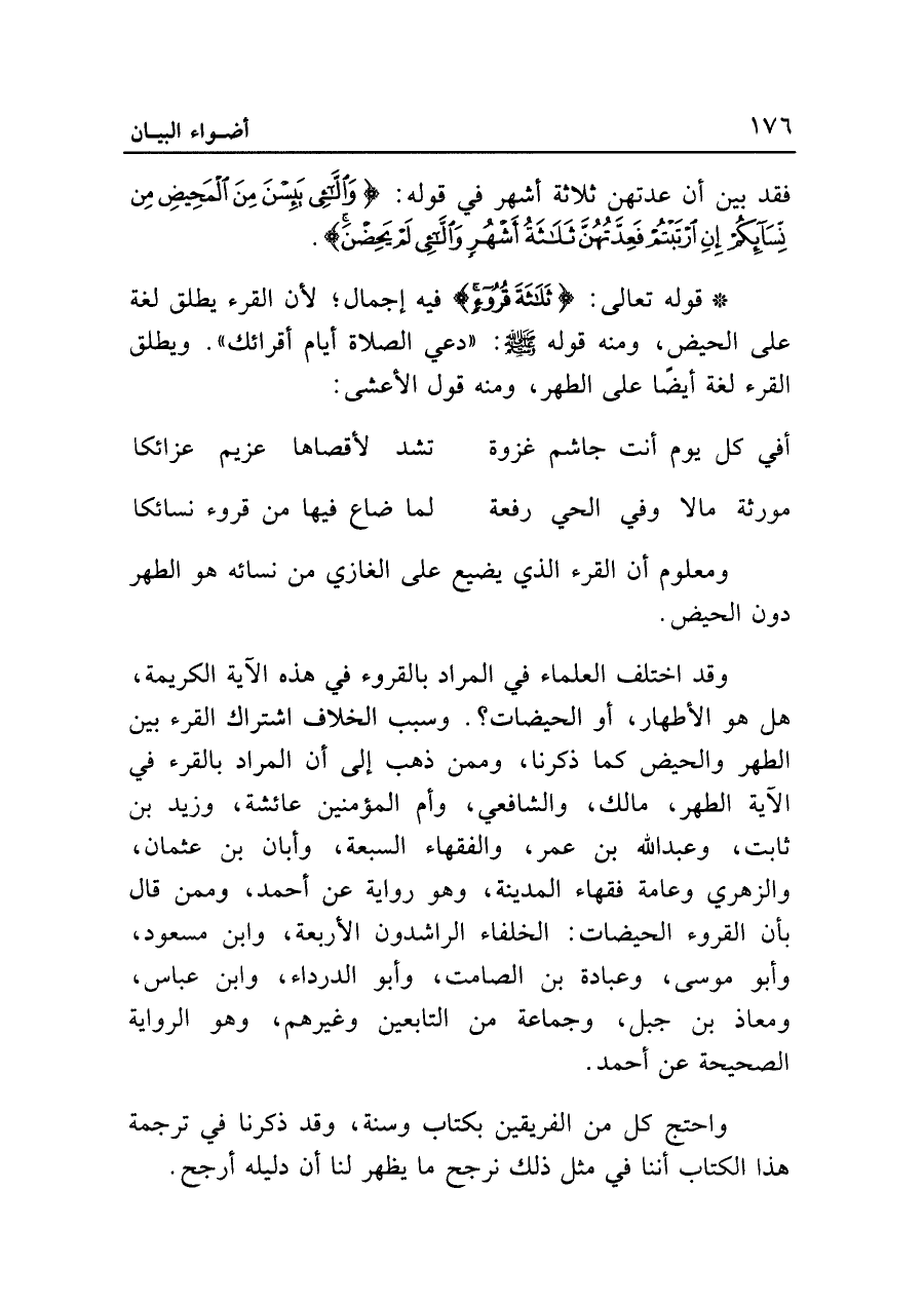 وقد اختلف العلماء في المراد بالقروء في هذه الآية الكريمة، هل هو الأطهار، أو الحيضات؛. وسبب الخلاف اشتراك القرء بين الطهر والحيض كما ذكرنا، وممن ذهب إلى أن المراد بالقرء في الآية الطهر، مالك، والشافعي، وأم المؤمنين عائشة، وزيد بن ثابت، وعبد الله بن عمر، والفقهاء السبعة، وأبان بن عثمان، والزهري وعامة فقهاء المدينة، وهو رواية عن أحمد، وممن قال بأن القروء الحيضات: الخلفاء الراشدون الأربعة، وابن مسعود، وأبو موسى، وعبادة بن الصامت، وأبو الدرداء، وابن عباس، ومعاذ بن جبل، وجماعة من التابعين وغيرهم، وهو الرواية الصحيحة عن أحمد.