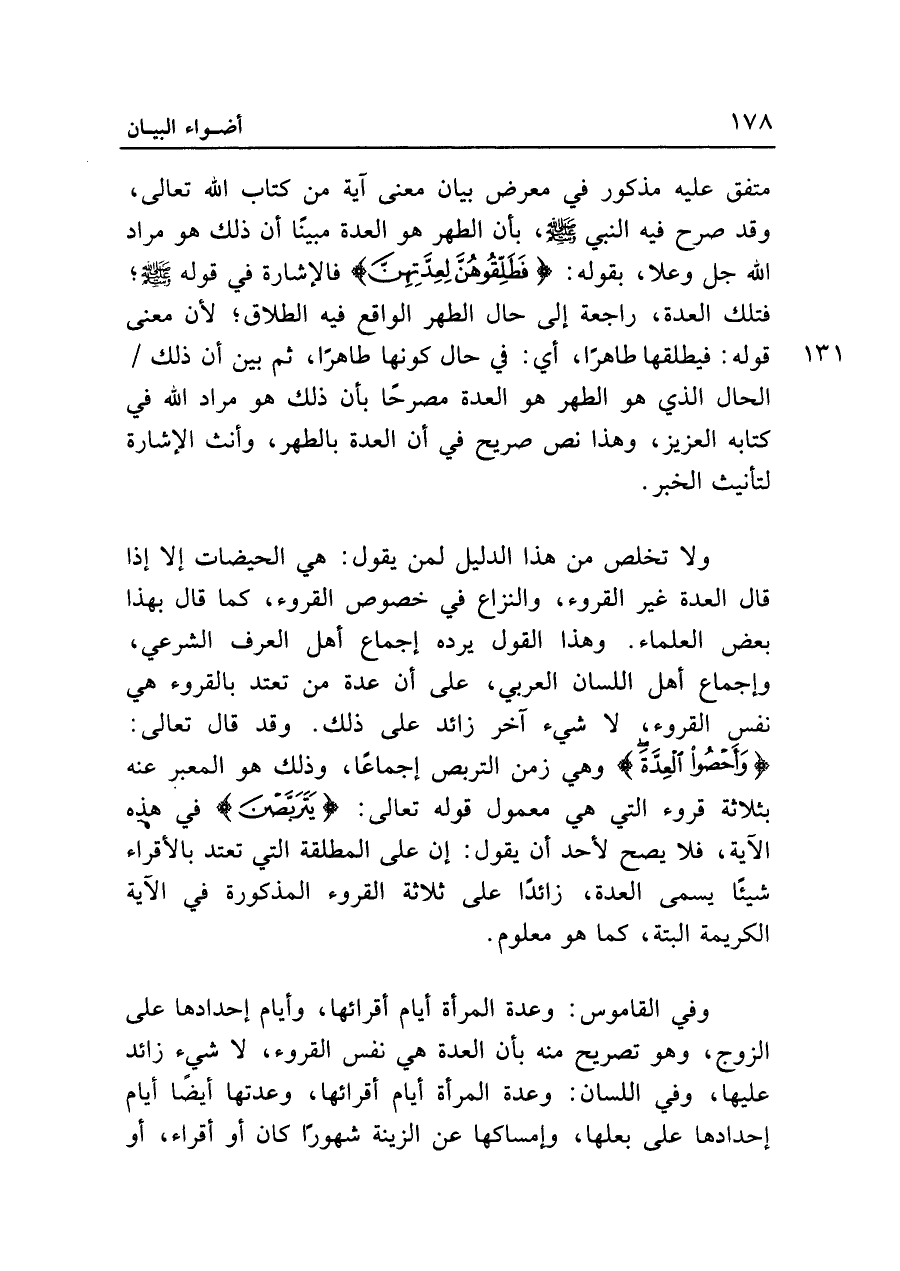 ولا تخلص من هذا الدليل لمن يقول: هي الحيضات إلا إذا قال العدة غير القروء، والنزاع في خصوص القروء، كما قال بهذا بعض العلماء. وهذا القول يرده إجماع أهل العرف الشرعي، وإجماع أهل اللسان العربي، على أن عدة من تعتد بالقروء هي نفس القروء، لا شيء آخر زائد على ذلك. وقد قال تعالى: {وَأَحْصُوا الْعِدَّةَ} وهي زمن التربص إجماعا، وذلك هو المعبر عنه بثلاثة قروء التي هي معمول قوله تعالى: {يَتَرَبَّصْنَ} في هذه الآية، فلا يصح لأحد أن يقول: إن على المطلقة التي تعتد بالأقراء شيئا يسمى العدة، زائدا على ثلاثة القروء المذكورة في الآية الكريمة البتة، كما هو معلوم.