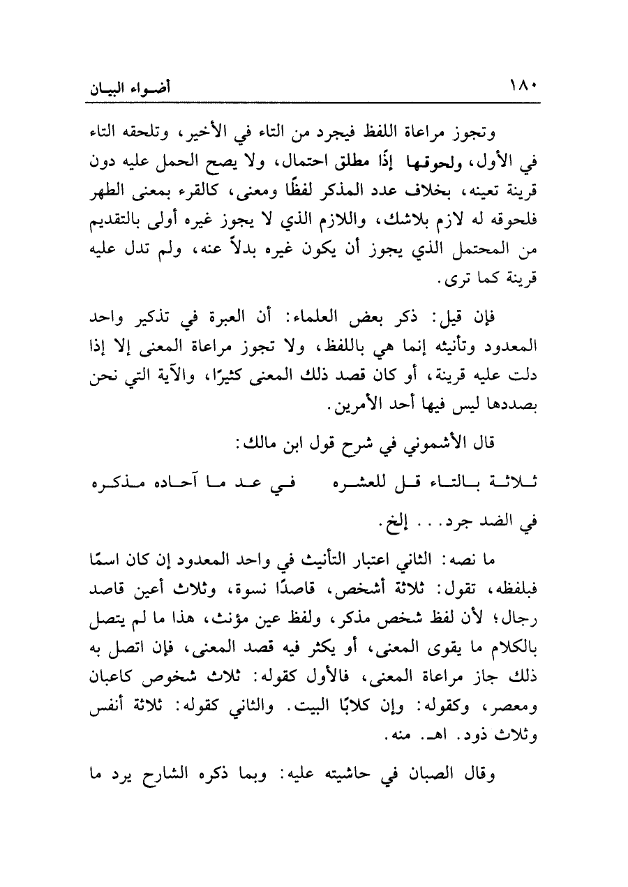 وتجوز مراعاة اللفظ فيجرد من التاء في الأخير، وتلحقه التاء في الأول، ولحوقها إذن مطلق احتمال، ولا يصح الحمل عليه دون قرينة تعينه، بخلاف عدد المذكر لفظا ومعنى، كالقرء بمعنى الطهر فلحوقه له لازم بلا شك، واللازم الذي لا يجوز غيره أولى بالتقديم من المحتمل الذي يجوز أن يكون غيره بدلا عنه، ولم تدل عليه قرينة كما ترى.