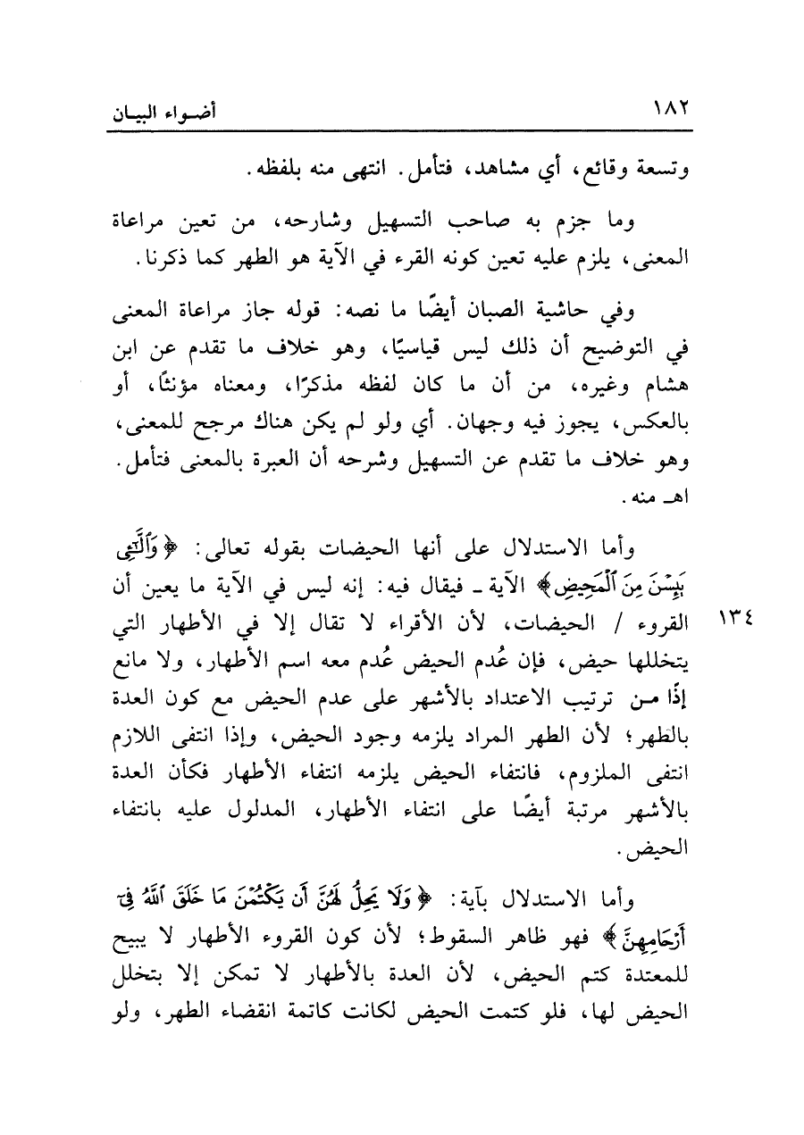 وأما الاستدلال على أنها الحيضات بقوله تعالى: {وَاللَّائِي يَئِسْنَ مِنَ الْمَحِيضِ} الآية - فيقال فيه: إنه ليس في الآية ما يعين أن القروء الحيضات، لأن الأقراء لا تقال إلا في الأطهار التي يتخللها حيض، فإن عدم الحيض عدم معه اسم الأطهار، ولا مانع إذن من ترتيب الاعتداد بالأشهر على عدم الحيض مع كون العدة بالطهر؛ لأن الطهر المراد يلزمه وجود الحيض، وإذا انتفى اللازم انتفى الملزوم، فانتفاء الحيض يلزمه انتفاء الأطهار فكأن العدة بالأشهر مرتبة أيضا على انتفاء الأطهار، المدلول عليه بانتفاء الحيض.