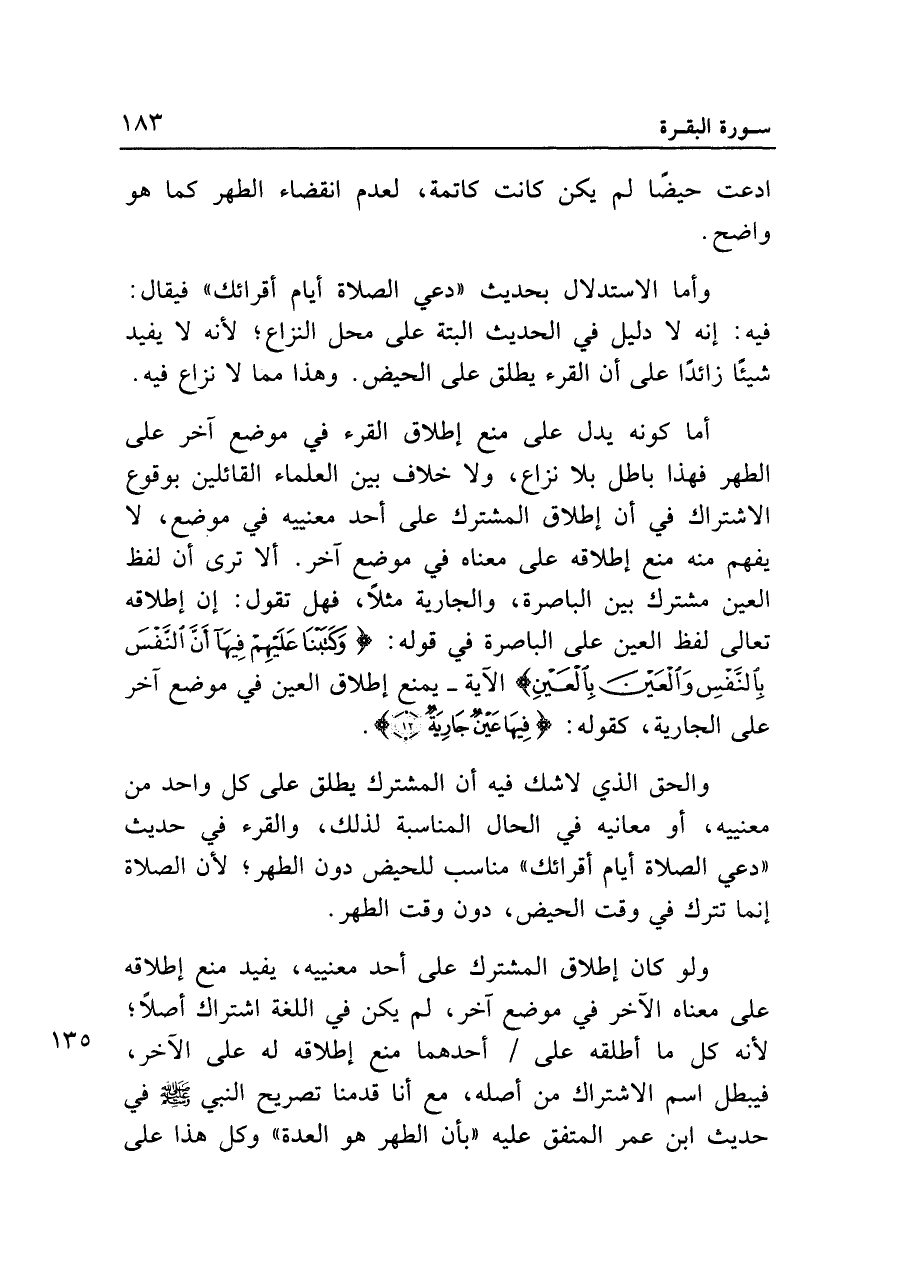 أما كونه يدل على منع إطلاق القرء في موضع آخر على الطهر فهذا باطل بلا نزاع، ولا خلاف بين العلماء القائلين بوقوع الاشتراك في أن إطلاق المشترك على أحد معنييه في موضع، لا يفهم منه منع إطلاقه على معناه في موضع آخر. ألا ترى أن لفظ العين مشترك بين الباصرة، والجارية مثلا، فهل تقول: إن إطلاقه تعالى لفظ العين على الباصرة في قوله: {وَكَتَبْنَا عَلَيْهِمْ فِيهَا أَنَّ النَّفْسَ بِالنَّفْسِ وَالْعَيْنَ بِالْعَيْنِ} الآية- يمنع إطلاق العين في موضع آخر على الجارية، كقوله: {فِيهَا عَيْنٌ جَارِيَةٌ (١٢)}.