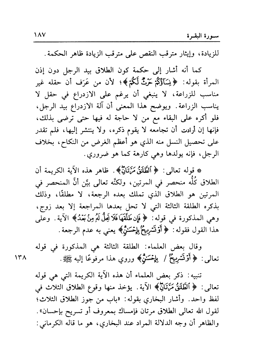 • قوله تعالى: {الطَّلاقُ مَرَّتَانِ}. ظاهر هذه الآية الكريمة أن الطلاق كله منحصر في المرتين، ولكنه تعالى بين أن المنحصر في المرتين هو الطلاق الذي تملك بعده الرجعة، لا مطلقا، وذلك بذكره الطلقة الثالثة التي لا تحل بعدها المراجعة إلا بعد زوج، وهي المذكورة في قوله: {فَإِنْ طَلَّقَهَا فَلا تَحِلُّ لَهُ مِنْ بَعْدُ} الآية. وعلى هذا القول فقوله: {أَوْ تَسْرِيحٌ بِإِحْسَانٍ} يعني به عدم الرجعة.