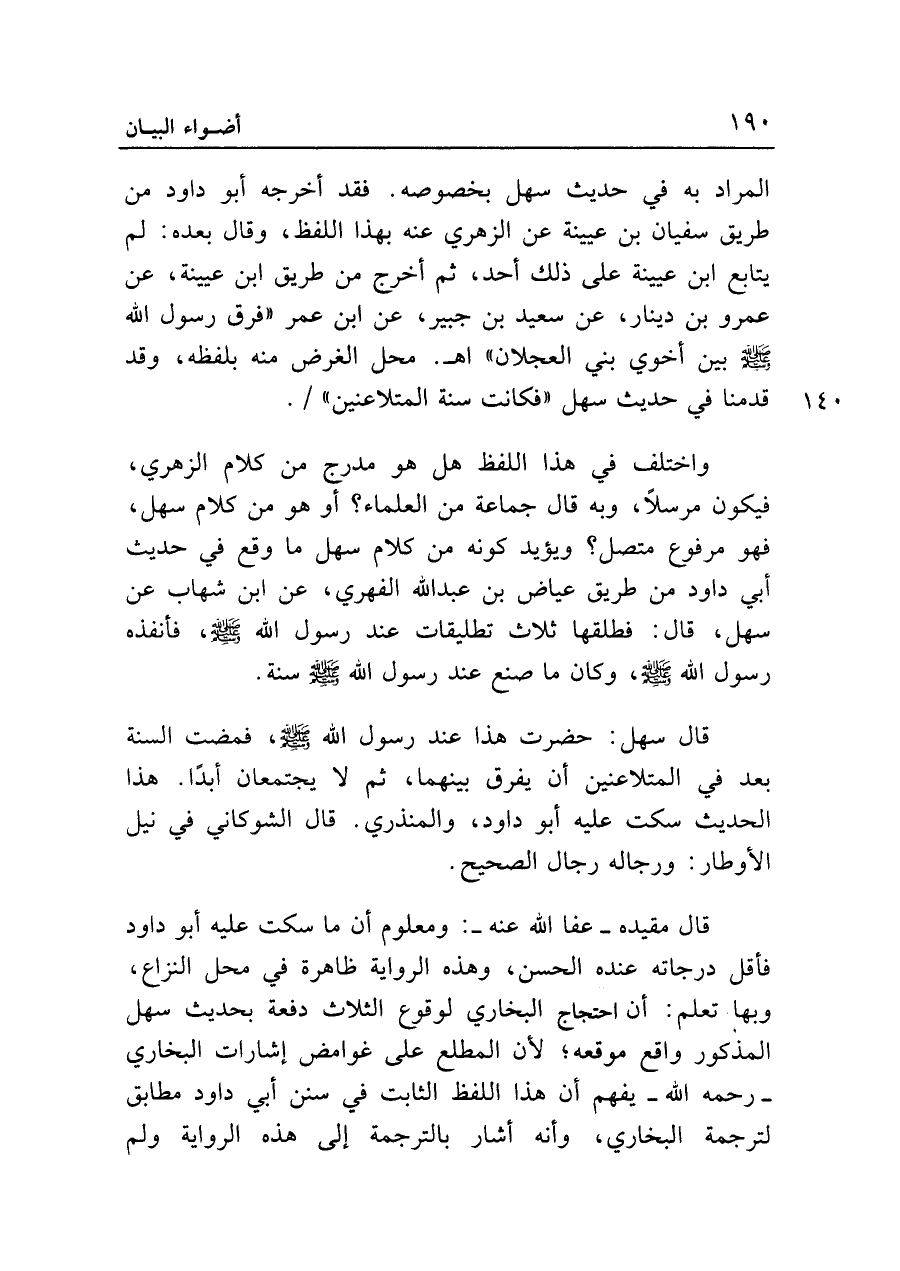 قال سهل: حضرت هذا عند رسول الله - صلى الله عليه وسلم -، فمضت السنة بعد في المتلاعنين أن يفرق بينهما، ثم لا يجتمعان أبدا. هذا الحديث سكت عليه أَبو داود، والمنذري. قال الشوكاني في نيل الأوطار: ورجاله رجال الصحيح.