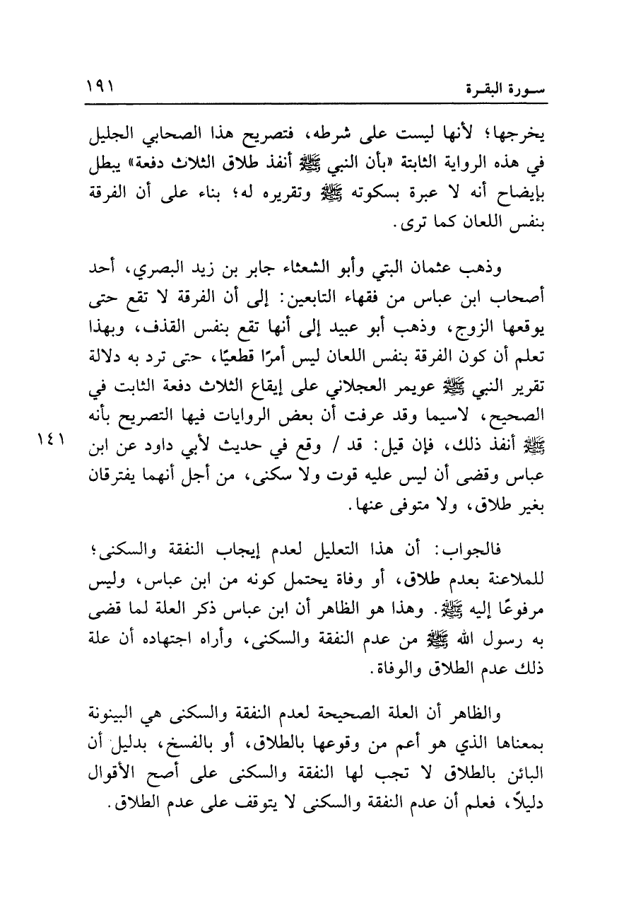 وذهب عثمان البتي وأبو الشعثاء جابر بن زيد البصري، أحد أصحاب ابن عباس من فقهاء التابعين: إلى أن الفرقة لا تقع حتى يوقعها الزوج، وذهب أبو عبيد إلى أنها تقع بنفس القذف، وبهذا تعلم أن كون الفرقة بنفس اللعان ليس أمرا قطعيا، حتى ترد به دلالة تقرير النبي - صلى الله عليه وسلم - عويمر العجلاني على إيقاع الثلاث دفعة الثابت في الصحيح، لا سيما وقد عرفت أن بعض الروايات فيها التصريح بأنه - صلى الله عليه وسلم - أنفذ ذلك، فإن قيل: قد وقع في حديث لأبي داود عن ابن عباس وقضى أن ليس عليه قوت ولا سكنى، من أجل أنهما يفترقان بغير طلاق، ولا متوفى عنها.