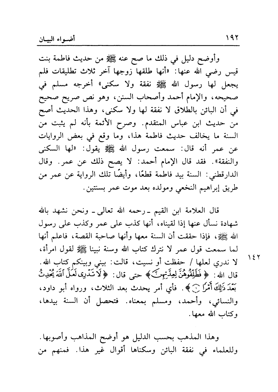 وأوضح دليل في ذلك ما صح عنه - صلى الله عليه وسلم - من حديث فاطمة بنت قيس رضي الله عنها: "أنها طلقها زوجها آخر ثلاث تطليقات فلم يجعل لها رسول الله علىيم نفقة ولا سكنى" أخرجه مسلم في صحيحه، والإمام أحمد وأصحاب السنن، وهو نص صريح صحيح في أن البائن بالطلاق لا نفقة لها ولا سكنى، وهذا الحديث أصح من حديث ابن عباس المتقدم. وصرح الأئمة بأنه لم يثبت من السنة ما يخالف حديث فاطمة هذا، وما وقع في بعض الروايات عن عمر أنه قال: سمعت رسول الله - صلى الله عليه وسلم - يقول: "لها السكنى والنفقة". فقد قال الإمام أحمد: لا يصح ذلك عن عمر. وقال الدارقطني: السنة بيد فاطمة قطعا، وأيضا تلك الرواية عن عمر من طريق إبراهيم النخعي ومولده بعد موت عمر بسنتين.