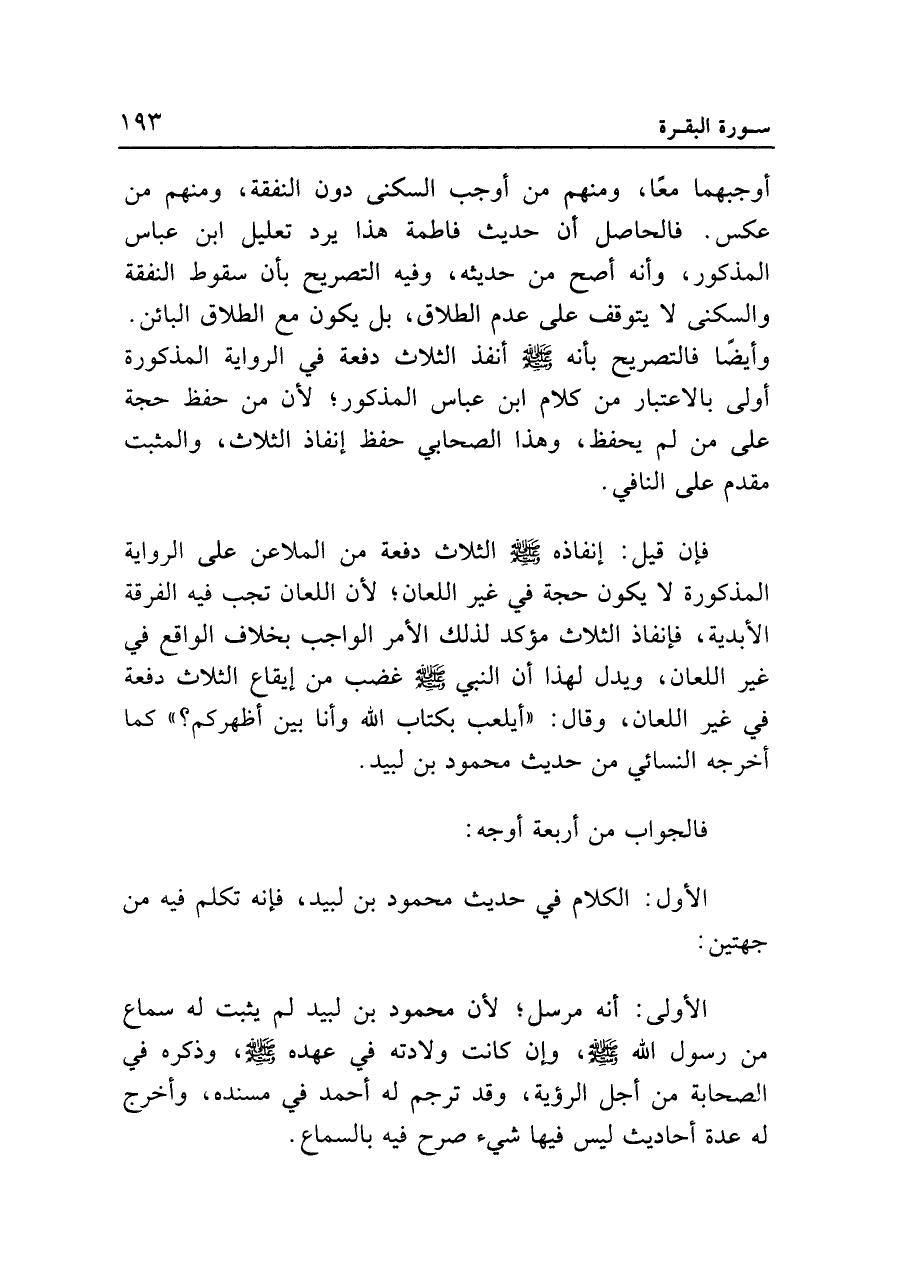 أوجبهما معا، ومنهم من أوجب السكنى دون النفقة، ومنهم من عكس. فالحاصل أن حديث فاطمة هذا يرد تعليل ابن عباس المذكور، وأنه أصح من حديثه، وفيه التصريح بأن سقوط النفقة والسكنى لا يتوقف على عدم الطلاق، بل يكون مع الطلاق البائن. وأيضا فالتصريح بأنه - صلى الله عليه وسلم - أنفذ الثلاث دفعة في الرواية المذكورة أولى بالاعتبار من كلام ابن عباس المذكور؛ لأن من حفظ حجة على من لم يحفظ، وهذا الصحابي حفظ إنفاذ الثلاث، والمثبت مقدم على النافي.
