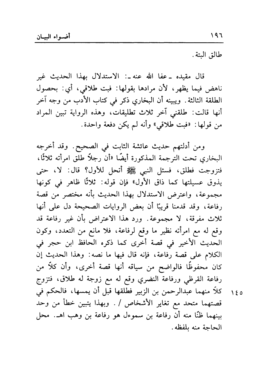 ومن أدلتهم حديث عائشة الثابت في الصحيح. وقد أخرجه البخاري تحت الترجمة المذكورة أيضا "أن رجلا طلق امرأته ثلاثا، فتزوجت فطلق، فسئل النبي - صلى الله عليه وسلم - أتحل للأول؟ قال: لا، حتى يذوق عسيلتها كما ذاق الأول" فإن قوله: ثلاثا ظاهر في كونها مجموعة، واعترض الاستدلال بهذا الحديث بأنه مختصر من قصة رفاعة، وقد قدمنا قريبا أن بعض الروايات الصحيحة دل على أنها ثلاث مفرقة، لا مجموعة. ورد هذا الاعتراض بأن غير رفاعة قد وقع له مع امرأته نظير ما وقع لرفاعة، فلا مانع من التعدد، وكون الحديث الأخير في قصة أخرى كما ذكره الحافظ ابن حجر في الكلام على قصة رفاعة، فإنه قال فيها ما نصه: وهذا الحديث إن كان محفوظا فالواضح من سياقه أنها قصة أخرى، وأن كلا من رفاعة القرظي ورفاعة النضري وقع له مع زوجة له طلاق، فتزوج كلا منهما عبد الرحمن بن الزبير فطلقها قبل أن يمسها، فالحكم في قصتهما متحد مع تغاير الأشخاص. وبهذا يتبين خطأ من وحد بينهما ظنا منه أن رفاعة بن سموءل هو رفاعة بن وهب اهـ. محل الحاجة منه بلفظه.