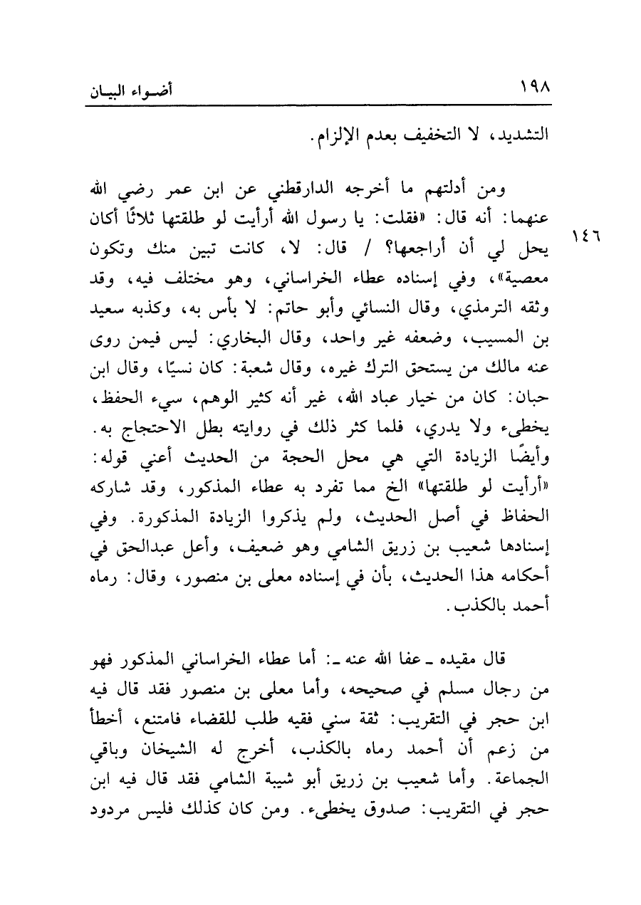 ومن أدلتهم ما أخرجه الدارقطني عن ابن عمر رضي الله عنهما: أنه قال: "فقلت: يا رسول الله أرأيت لو طلقتها ثلاثا أكان يحل لي أن أراجعها؟ قال: لا، كانت تبين منك وتكون معصية"، وفي إسناده عطاء الخراساني، وهو مختلف فيه، وقد وثقه الترمذي، وقال النسائي وأبو حاتم: لا بأس به، وكذبه سعيد بن المسيب، وضعفه غير واحد، وقال البخاري: ليس فيمن روي عنه مالك من يستحق الترك غيره، وقال شعبة: كان نسيا، وقال ابن حبان: كان من خيار عباد الله، غير أنه كثير الوهم، سيء الحفظ، يخطئ ولا يدري، فلما كثر ذلك في روايته بطل الاحتجاج به. وأيضا الزيادة التي هي محل الحجة من الحديث أعني قوله: "أرأيت لو طلقتها" الخ مما تفرد به عطاء المذكور، وقد شاركه الحفاظ في أصل الحديث، ولم يذكروا الزيادة المذكورة. وفي إسنادها شعيب بن زريق الشامي وهو ضعيف، وأعل عبد الحق في أحكامه هذا الحديث، بأن في أسناده معلى بن منصور، وقال: رماه أحمد بالكذب.