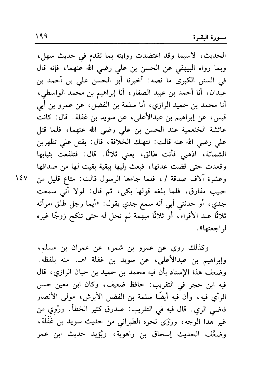 الحديث، لا سيما وقد اعتضدت روايته بما تقدم في حديث سهل، وبما رواه البيهقي عن الحسن بن علي رضي الله عنهما، فإنه قال في السنن الكبرى ما نصه: أخبرنا أبو الحسن علي بن أحمد بن عبدان، أنا أحمد بن عبيد الصفار، أنا إبراهيم بن محمد الواسطي، أنا محمد بن حميد الرازي، أنا سلمة بن الفضل، عن عمرو بن أبي قيس، عن إبراهيم بن عبد الأعلى، عن سويد بن غفلة. قال: كانت عائشة الخثعمية عند الحسن بن علي رضي الله عنهما، فلما قتل علي رضي الله عنه قالت: لتهنك الخلافة، قال: بقتل علي تظهرين الشماتة، إذهبي فأنت طالق، يعني ثلاثا. قال: فتلفعت بثيابها وقعدت حتى قضت عدتها، فبعث إليها ببقية بقيت لها من صداقها وعشرة آلاف صدقة، فلما جاءها الرسول قالت: متاع قليل من حبيب مفارق، فلما بلغه قولها بكى، ثم قال: لولا أني سمعت جدي، أو حدثني أبي أنه سمع جدي يقول: "أيما رجل طلق امرأته ثلاثا عند الأقراء، أو ثلاثا مبهمة لم تحل له حتى تنكح زوجا غيره لراجعتها".