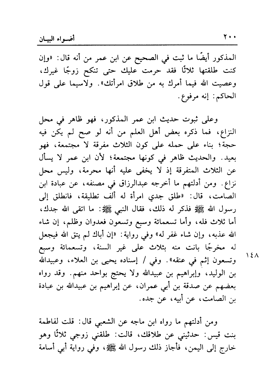 وعلى ثبوت حديث ابن عمر المذكور، فهو ظاهر في محل النزاع، فما ذكره بعض أهل العلم من أنه لو صح لم يكن فيه حجة؛ بناء على حمله على كون الثلاث مفرقة لا مجتمعة، فهو بعيد. والحديث ظاهر في كونها مجتمعة؛ لأن ابن عمر لا يسأل عن الثلاث المتفرقة إذ لا يخفى عليه أنها محرمة، وليس محل نزاع. ومن أدلتهم ما أخرجه عبد الرزاق في مصنفه، عن عبادة ابن الصامت، قال: "طلق جدي امرأة له ألف تطليقة، فانطلق إلى رسول الله - صلى الله عليه وسلم - فذكر له ذلك، فقال النبي - صلى الله عليه وسلم -: ما اتقى الله جدك، أما ثلاث فله، وأما تسعمائة وسبع وتسعون فعدوان وظلم، إن شاء الله عذبه، وإن شاء غفر له" وفي رواية: "إن أباك لم يتق الله فيجعل له مخرجا بانت منه بثلاث على غير السنة، وتسعمائة وسبع وتسعون إثم في عنقه". وفي إسناده يحيى بن العلاء، وعبيد الله بن الوليد، وإبراهيم بن عبيد الله ولا يحتج بواحد منهم. وقد رواه بعضهم عن صدقة بن أبي عمران، عن إبراهيم بن عبيد الله بن عبادة بن الصامت، عن أبيه، عن جده.