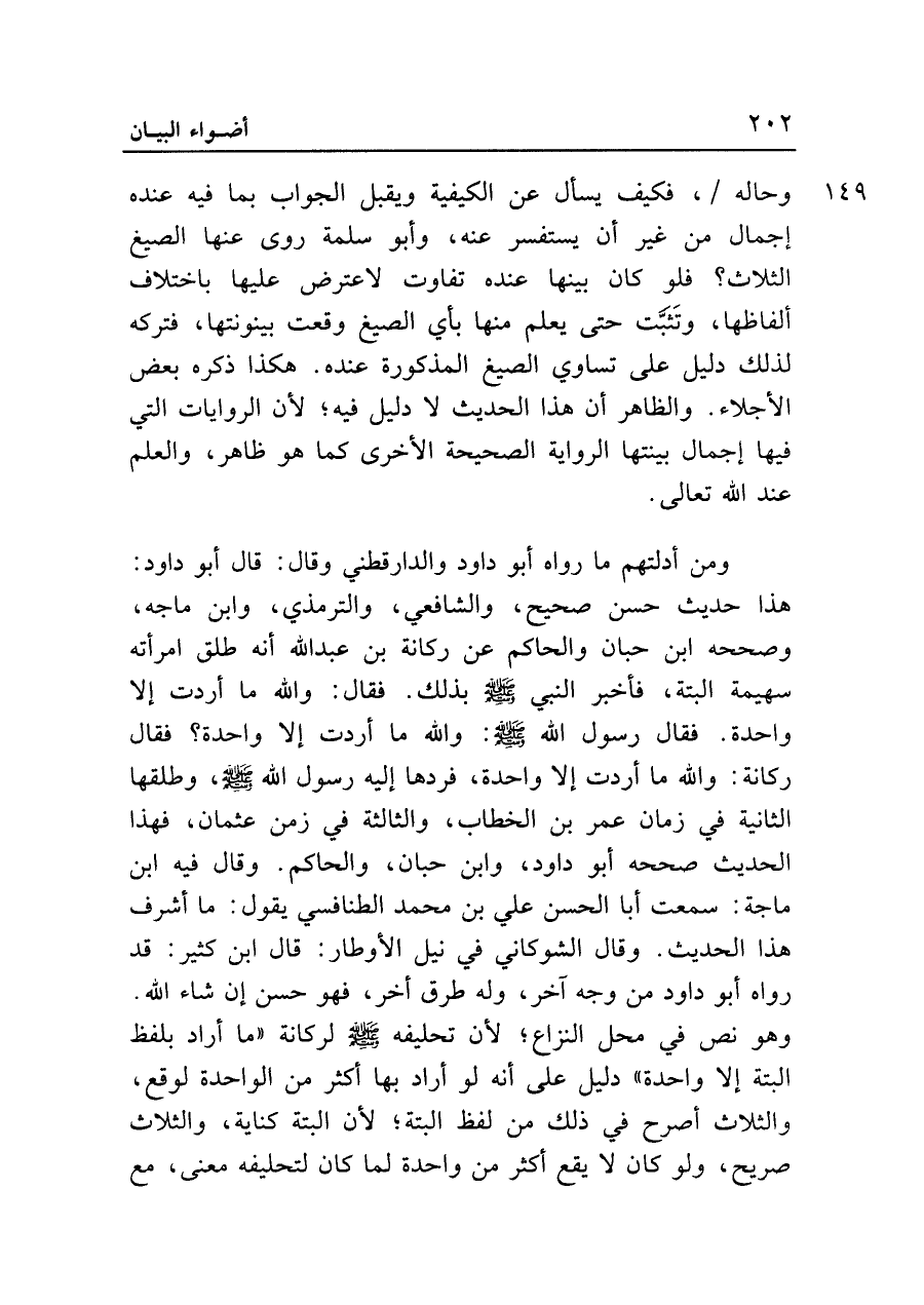 ومن أدلتهم ما رواه أبو داود والدارقطني وقال: قال أبو داود: هذا حديث حسن صحيح، والشافعي، والترمذي، وابن ماجه، وصححه ابن حبان والحاكم عن ركانة بن عبد الله أنه طلق امرأته سهيمة البتة، فأخبر النبي - صلى الله عليه وسلم - بذلك. فقال: والله ما أردت إلا واحدة. فقال رسول الله - صلى الله عليه وسلم -: والله ما أردت إلا واحدة؛ فقال ركانة: والله ما أردت إلا واحدة، فردها إليه رسول الله - صلى الله عليه وسلم -، وطلقها الثانية في زمان عمر بن الخطاب، والثالثة في زمن عثمان، فهذا الحديث صححه أبو داود، وابن حبان، والحاكم. وقال فيه ابن ماجه: سمعت أبا الحسن علي بن محمد الطنافسي يقول: ما أشرف هذا الحديث. وقال الشوكاني في نيل الأوطار: قال ابن كثير: قد رواه أبو داود من وجه آخر، وله طرق أخر، فهو حسن إن شاء الله.