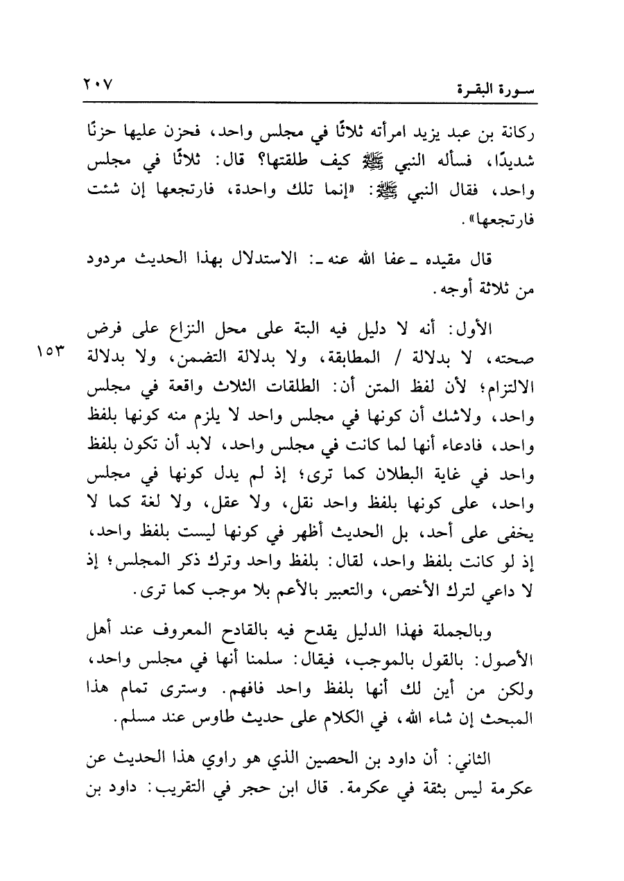 وبالجملة فهذا الدليل يقدح فيه بالقادح المعروف عند أهل الأصول: بالقول بالموجب، فيقال: سلمنا أنها في مجلس واحد، ولكن من أين لك أنها بلفظ واحد فافهم. وسترى تمام هذا المبحث إن شاء الله، في الكلام على حديث طاوس عند مسلم.