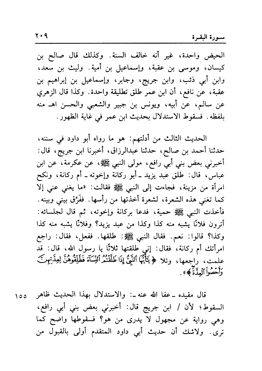 الحديث الثالث من أدلتهم: هو ما رواه أبو داود في سننه، حدثنا أحمد بن صالح، حدثنا عبد الرزاق، أخبرنا ابن جريج، قال: أخبرني بعض بني أبي رافع، مولى النبي - صلى الله عليه وسلم -، عن عكرمة، عن ابن عباس، قال: طلق عبد يزيد - أبو ركانة وإخوته - أم ركانة، ونكح امرأة من مزينة، فجاءت إلى النبي - صلى الله عليه وسلم - فقالت: "ما يغني عني إلا كما تغني هذه الشعرة، لشعرة أخذتها من رأسها. ففرق بيني وبينه. فأخذت النبي - صلى الله عليه وسلم - حمية، فدعا بركانة وإخوته، ثم قال لجلسائه: أترون فلانا يشبه منه كذا وكذا من عبد يزيد؟ وفلانا يشبه منه كذا وكذا؟ قالوا: نعم. فقال النبي - صلى الله عليه وسلم -: طلقها. ففعل، فقال: راجع امرأتك أم ركانة، فقال: إني طلقتها ثلاثا يا رسول الله، قال: قد علمت، راجعها، {يَا أَيُّهَا النَّبِيُّ إِذَا طَلَّقْتُمُ النِّسَاءَ فَطَلِّقُوهُنَّ لِعِدَّتِهِنَّ وَأَحْصُوا الْعِدَّةَ} ".
