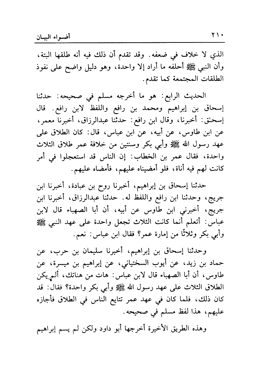 الحديث الرابع: هو ما أخرجه مسلم في صحيحه: حدثنا إسحاق بن إبراهيم ومحمد بن رافع واللفظ لابن رافع. قال إسحاق: أخبرنا، وقال ابن رافع: حدثنا عبد الرزاق، أخبرنا معمر، عن ابن طاوس، عن أبيه، عن ابن عباس، قال: كان الطلاق على عهد رسول الله - صلى الله عليه وسلم - وأبي بكر وسنتين من خلافة عمر طلاق الثلاث واحدة، فقال عمر بن الخطاب: إن الناس قد استعجلوا في أمر كانت لهم فيه أناة، فلو أمضيناه عليهم، فأمضاه عليهم.
