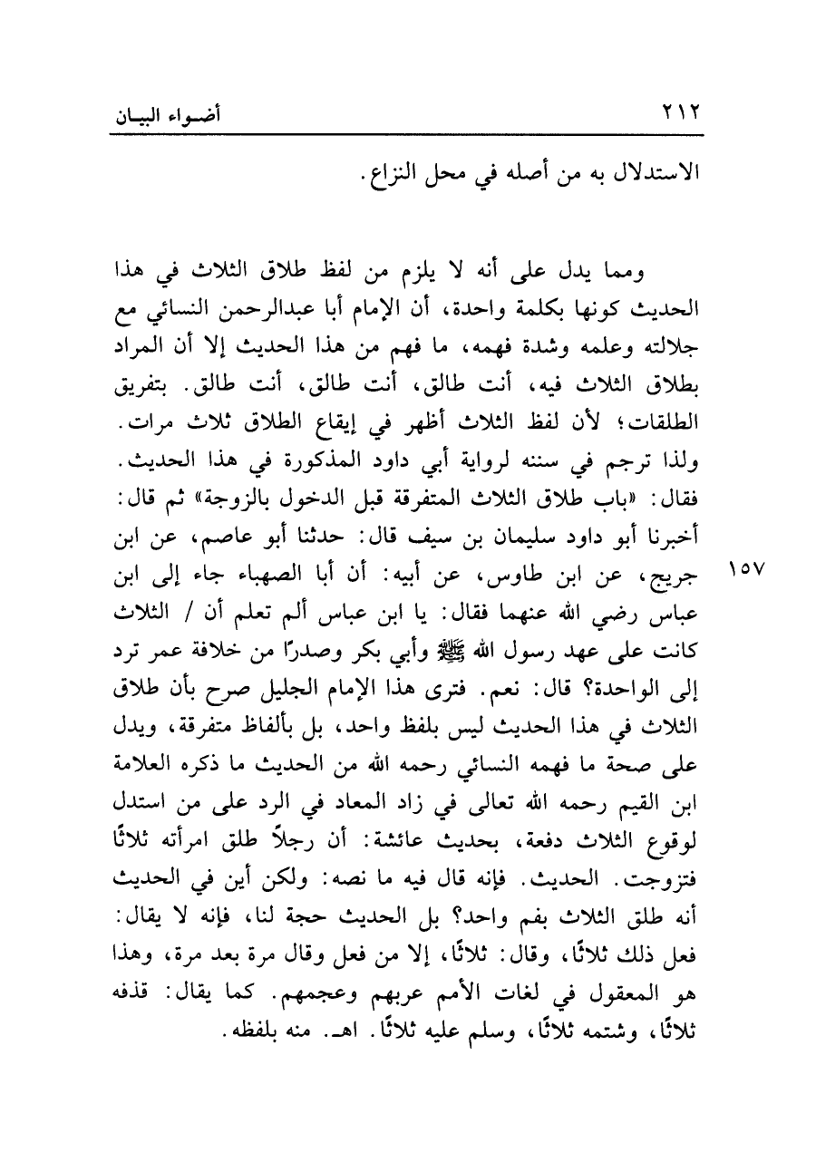 ومما يدل على أنه لا يلزم من لفظ طلاق الثلاث في هذا الحديث كونها بكلمة واحدة، أن الإمام أبا عبد الرحمن النسائي مع جلالته وعلمه وشدة فهمه، ما فهم من هذا الحديث إلا أن المراد بطلاق الثلاث فيه، أنت طالق، أنت طالق، أنت طالق. بتفريق الطلقات؛ لأن لفظ الثلاث أظهر في إيقاع الطلاق ثلاث مرات. ولذا ترجم في سننه لرواية أبي داود المذكورة في هذا الحديث. فقال: "باب طلاق الثلاث المتفرقة قبل الدخول بالزوجة" ثم قال: أخبرنا أبو داود سليمان بن سيف قال: حدثنا أبو عاصم، عن ابن جريج، عن ابن طاوس، عن أبيه: أن أبا الصهباء جاء إلى ابن عباس رضي الله عنهما فقال: يا ابن عباس ألم تعلم أن الثلاث كانت على عهد رسول الله - صلى الله عليه وسلم - وأبي بكر وصدرا من خلافة عمر ترد إلى الواحدة؟ قال: نعم. فترى هذا الإمام الجليل صرح بأن طلاق الثلاث في هذا الحديث ليس بلفظ واحد، بل بإلفاظ متفرقة، ويدل على صحة ما فهمه النسائي رحمه الله من الحديث ما ذكره العلامة ابن القيم رحمه الله تعالى في زاد المعاد في الرد على من استدل لوقوع الثلاث دفعة، بحديث عائشة: أن رجلا طلق امرأته ثلاثا فتزوجت. الحديث. فإنه قال فيه ما نصه: ولكن أين في الحديث أنه طلق الثلاث بفم واحد؟ بل الحديث حجة لنا، فإنه لا يقال: فعل ذلك ثلاثا، وقال: ثلاثا، إلا من فعل وقال مرة بعد مرة، وهذا هو المعقول في لغات الأمم عربهم وعجمهم. كما يقال: قذفه ثلاثا، وشتمه ثلاثا، وسلم عليه ثلاثا. اهـ. منه بلفظه.