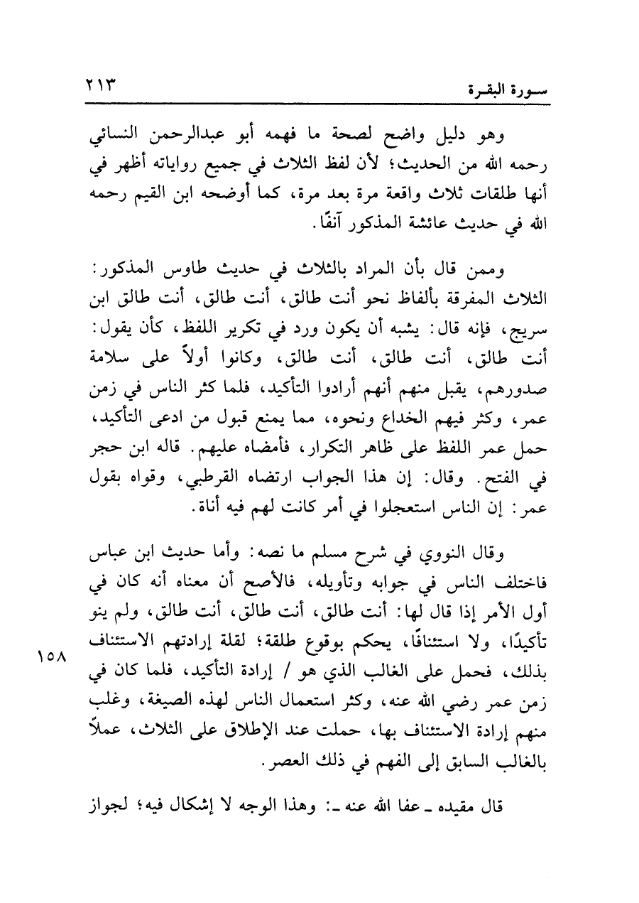وقال النووي في شرح مسلم ما نصه: وأما حديث ابن عباس فاختلف الناس في جوابه وتأويله، فالأصح أن معناه أنه كان في أول الأمر إذا قال لها: أنت طالق، أنت طالق، أنت طالق، ولم ينو تأكيدا، ولا استئنافا، يحكم بوقوع طلقة؛ لقلة إرادتهم الاستئناف بذلك، فحمل على الغالب الذي هو إرادة التأكيد، فلما كان في زمن عمر رضي الله عنه، وكثر استعمال الناس لهذه الصيغة، وغلب منهم إرادة الاستئناف بها، حملت عند الإطلاق على الثلاث، عملا بالغالب السابق إلى الفهم في ذلك العصر.