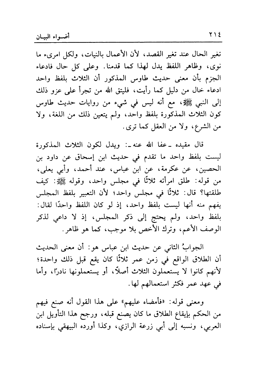 تغير الحال عند تغير القصد، لأن الأعمال بالنيات، ولكل امرىء ما نوى، وظاهر اللفظ يدل لهذا كما قدمنا. وعلى كل حال فادعاء الجزم بأن معنى حديث طاوس المذكور أن الثلاث بلفظ واحد ادعاء خال من دليل كما رأيت، فليتق الله من تجرأ على عزو ذلك إلى النبي - صلى الله عليه وسلم -، مع أنه ليس في شيء من روايات حديث طاوس كون الثلاث المذكورة بلفظ واحد، ولم يتعين ذلك من اللغة، ولا من الشرع، ولا من العقل كما ترى.