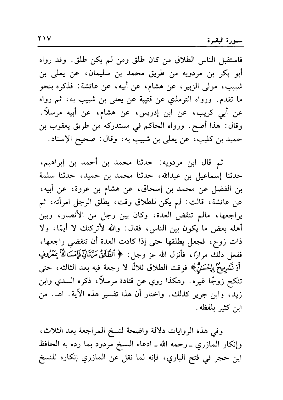 ثم قال ابن مردويه: حدثنا محمد بن أحمد بن إبراهيم، حدثنا إسماعيل بن عبد الله، حدثنا محمد بن حميد، حدثنا سلمة بن الفضل عن محمد بن إسحاق، عن هشام بن عروة، عن أبيه، عن عائشة، قالت: لم يكن للطلاق وقت، يطلق الرجل امرأته، ثم يراجعها، ما لم تنقض العدة، وكان بين رجل من الأنصار، وبين أهله بعض ما يكون بين الناس، فقال: والله لأتركنك لا أيما، ولا ذات زوج، فجعل يطلقها حتى إذا كادت العدة أن تنقضي راجعها، ففعل ذلك مرارا، فأنزل الله عز وجل: {الطَّلاقُ مَرَّتَانِ فَإِمْسَاكٌ بِمَعْرُوفٍ أَوْ تَسْرِيحٌ بِإِحْسَانٍ} فوقت الطلاق ثلاثا لا رجعة فيه بعد الثالثة، حتى تنكح زوجا غيره. وهكذا روي عن قتادة مرسلا، ذكره السدي وابن زيد، وابن جرير كذلك. واختار أن هذا تفسير هذه الآية. اهـ. من ابن كثير بلفظه.