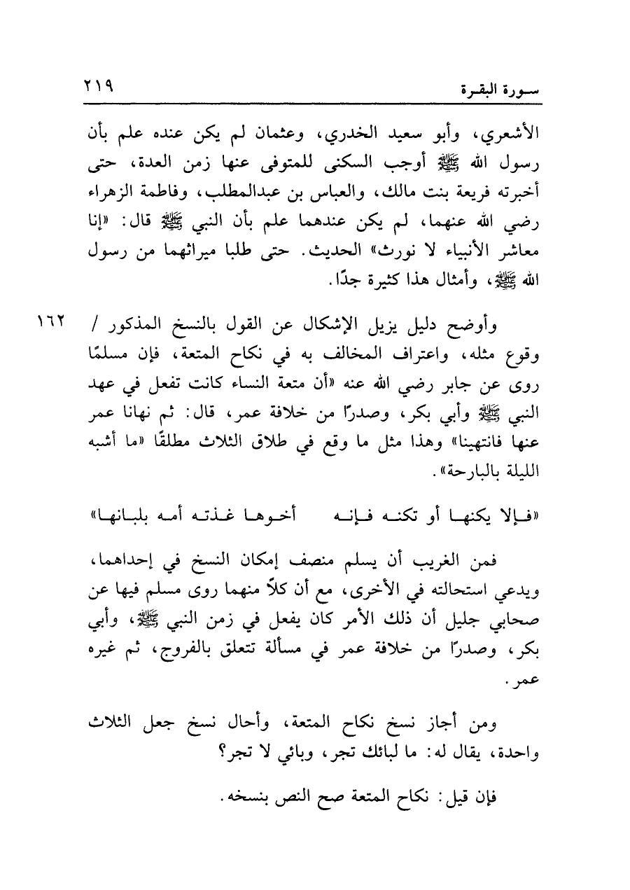 الأشعري، وأبو سعيد الخدري، وعثمان لم يكن عنده علم بأن رسول الله - صلى الله عليه وسلم - أوجب السكنى للمتوفى عنها زمن العدة، حتى أخبرته فريعة بنت مالك، والعباس بن عبد المطلب، وفاطمة الزهراء رضي الله عنهما، لم يكن عندهما علم بأن النبي - صلى الله عليه وسلم - قال: "إنا معاشر الأنبياء لا نورث" الحديث. حتى طلبا ميراثهما من رسول الله - صلى الله عليه وسلم -، وأمثال هذا كثيرة جدا.