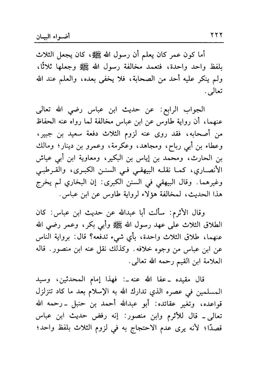 قال مقيده - عفا الله عنه -: فهذا إمام المحدثين، وسيد المسلمين في عصره الذي تدارك الله به الإسلام بعد ما كاد تتزلزل قواعده، وتغير عقائده: أبو عبد الله أحمد بن حنبل -رحمه الله تعالى- قال للأثرم وابن منصور: إنه رفض حديث ابن عباس قصدا؛ لأنه يرى عدم الاحتجاج به في لزوم الثلاث بلفظ واحد،