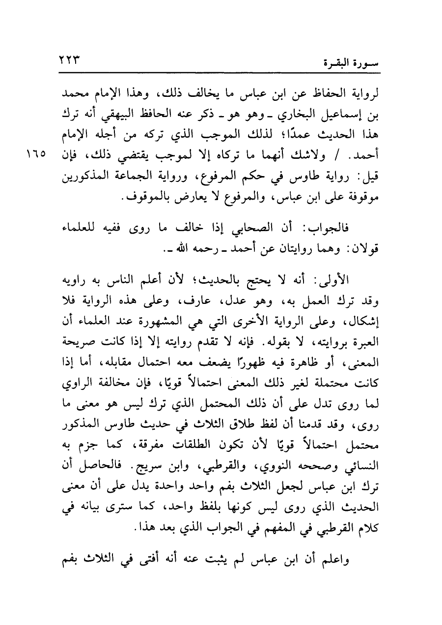 الأولى: أنه لا يحتج بالحديث؛ لأن أعلم الناس به راويه وقد ترك العمل به، وهو عدل، عارف، وعلى هذه الرواية فلا إشكال، وعلى الرواية الأخرى التي هي المشهورة عند العلماء أن العبرة بروايته، لا بقوله. فإنه لا تقدم روايته إلا إذا كانت صريحة المعنى، أو ظاهرة فيه ظهورا يضعف معه احتمال مقابله، أما إذا كانت محتملة لغير ذلك المعنى احتمالا قويا، فإن مخالفة الراوي لما روى تدل على أن ذلك المحتمل الذي ترك ليس هو معنى ما روى، وقد قدمنا أن لفظ طلاق الثلاث في حديث طاوس المذكور محتمل احتمالا قويا لأن تكون الطلقات مفرقة، كما جزم به النسائي وصححه النووي، والقرطبي، وابن سريج. فالحاصل أن ترك ابن عباس لجعل الثلاث بفم واحد واحدة يدل على أن معنى الحديث الذي روي ليس كونها بلفظ واحد، كما سترى بيانه في كلام القرطبي في المفهم في الجواب الذي بعد هذا.