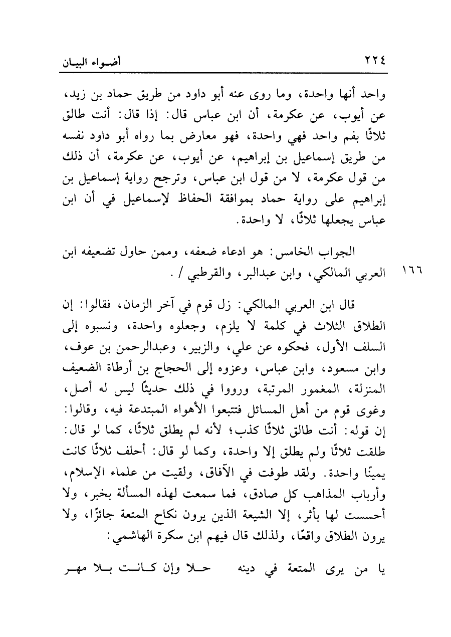 قال ابن العربي المالكي: زل قوم في آخر الزمان، فقالوا: إن الطلاق الثلاث في كلمة لا يلزم، وجعلوه واحدة، ونسبوه إلى السلف الأول، فحكوه عن علي، والزبير، وعبد الرحمن بن عوف، وابن مسعود، وابن عباس، وعزوه إلى الحجاج بن أرطاة الضعيف المنزلة، المغمور المرتبة، ورووا في ذلك حديثا ليس له أصل، وغوى قوم من أهل المسائل فتتبعوا الأهواء المبتدعة فيه، وقالوا: إن قوله: أنت طالق ثلاثا كذب، لأنه لم يطلق ثلاثا، كما لو قال: طلقت ثلاثا ولم يطلق إلا واحدة، وكما لو قال: أحلف ثلاثا كانت يمينا واحدة. ولقد طوفت في الآفاق، ولقيت من علماء الإسلام، وأرباب المذاهب كل صادق، فما سمعت لهذه المسألة بخبر، ولا أحسست لها بأثر، إلا الشيعة الذين يرون نكاح المتعة جائزا، ولا يرون الطلاق واقعا، ولذلك قال فيهم ابن سكرة الهاشمي: