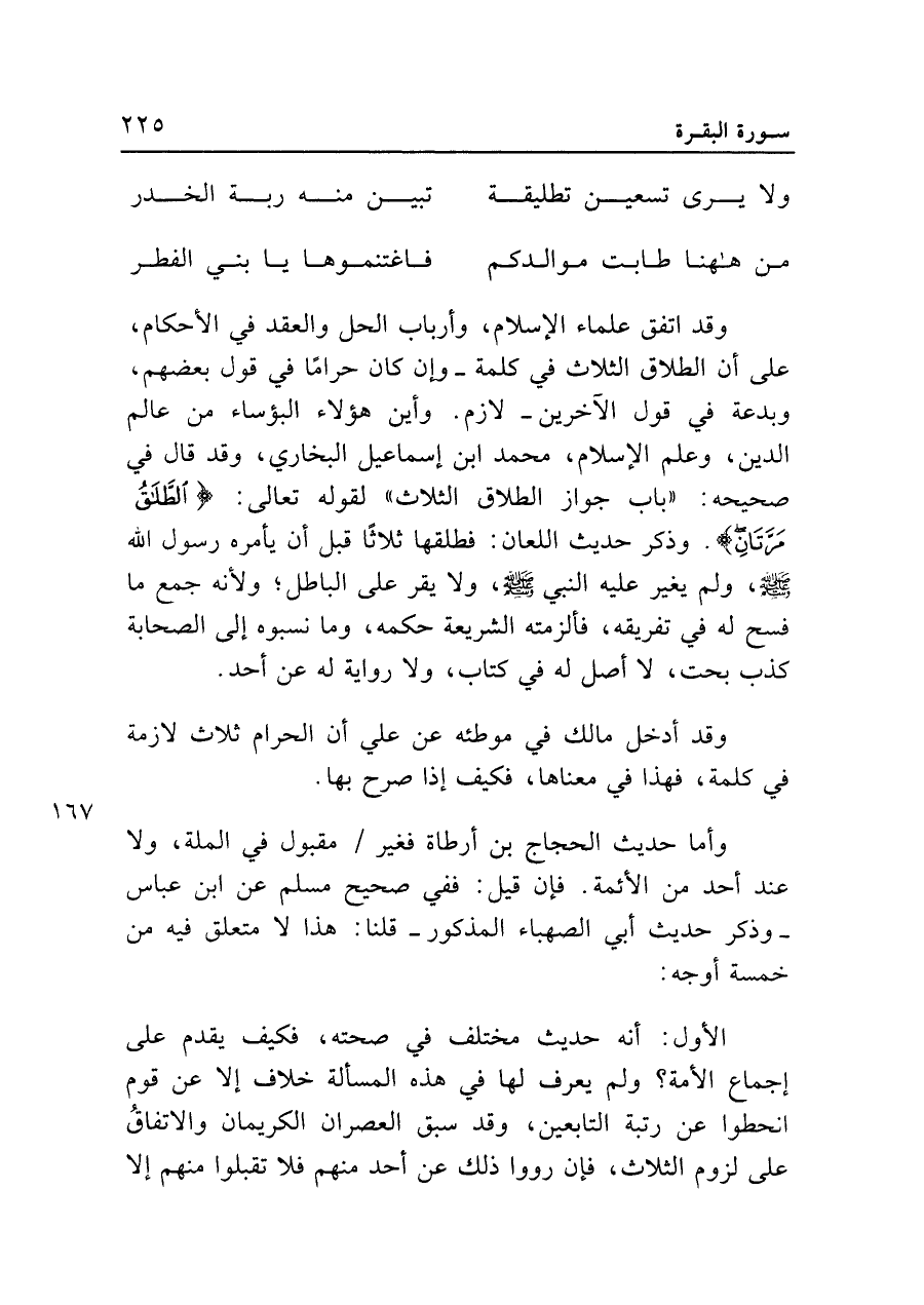 وقد اتفق علماء الإسلام، وأرباب الحل والعقد في الأحكام، على أن الطلاق الثلاث في كلمة -وإن كان حراما في قول بعضهم، وبدعة في قول الآخرين- لازم. وأين هؤلاء البؤساء من عالم الدين، وعلم الإسلام، محمد بن إسماعيل البخاري، وقد قال في صحيحه: "باب جواز الطلاق الثلاث" لقوله تعالى: {الطَّلاقُ مَرَّتَانِ}. وذكر حديث اللعان: فطلقها ثلاثا قبل أن يأمره رسول الله - صلى الله عليه وسلم -، ولم يغير عليه النبي - صلى الله عليه وسلم -، ولا يقر على الباطل؛ ولأنه جمع ما فسح له في تفريقه، فألزمته الشريعة حكمه، وما نسبوه إلى الصحابة كذب بحت، لا أصل له في كتاب، ولا رواية له عن أحد.