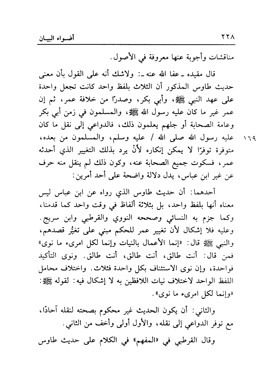 قال مقيده - عفا الله عنه -: ولا شك أنه على القول بأن معنى حديث طاوس المذكور أن الثلاث بلفظ واحد كانت تجعل واحدة على عهد النبي - صلى الله عليه وسلم -، وأبي بكر، وصدرا من خلافة عمر، ثم إن عمر غير ما كان عليه رسول الله - صلى الله عليه وسلم -، والمسلمون في زمن أبي بكر وعامة الصحابة أو جلهم يعلمون ذلك، فالدواعي إلى نقل ما كان عليه رسول الله صلى الله عليه وسلم ، والمسلمون من بعده، متوفرة توفرا لا يمكن إنكاره لأن يرد بذلك التغيير الذي أحدثه عمر، فسكوت جميع الصحابة عنه، وكون ذلك لم ينقل منه حرف عن غير ابن عباس، يدل دلالة واضحة على أحد أمرين:
