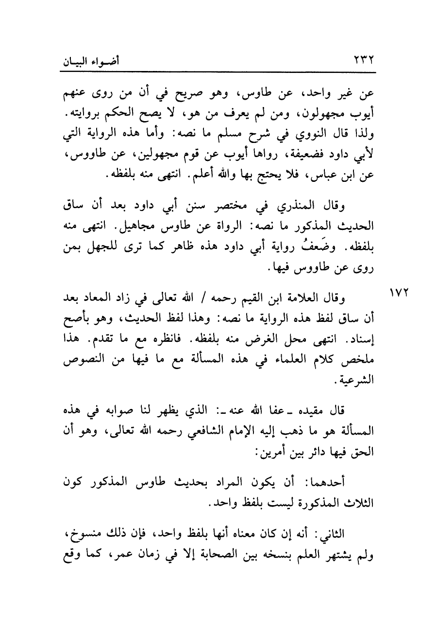 عن غير واحد، عن طاوس، وهو صريح في أن من روى عنهم أيوب مجهولون، ومن لم يعرف من هو، لا يصح الحكم بروايته. ولذا قال النووي في شرح مسلم ما نصه: وأما هذه الرواية التي لأبي داود فضعيفة، رواها أيوب عن قوم مجهولين، عن طاووس، عن ابن عباس، فلا يحتج بها والله أعلم. انتهى منه بلفظه.