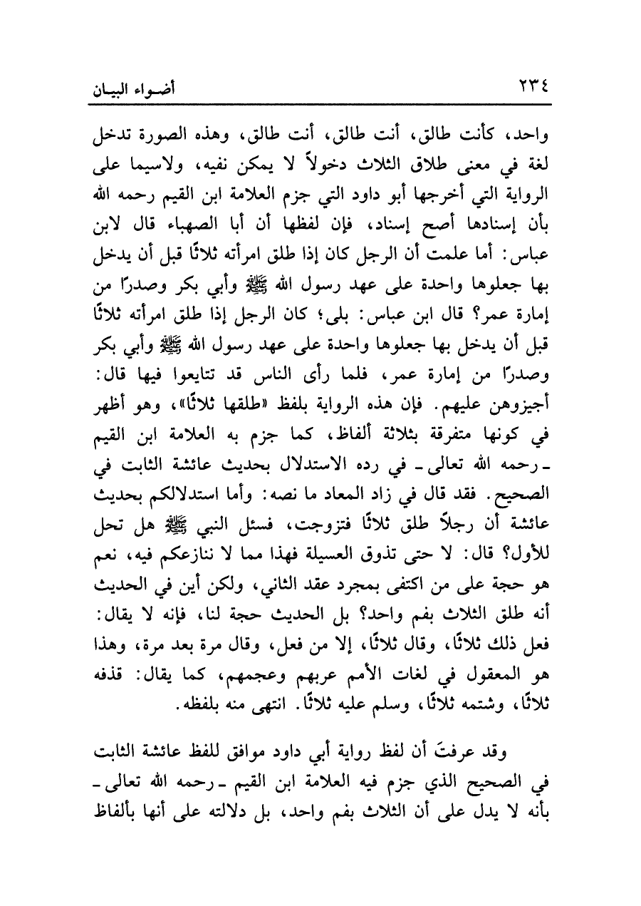 واحد، كأنت طالق، أنت طالق، أنت طالق، وهذه الصورة تدخل لغة في معنى طلاق الثلاث دخولا لا يمكن نفيه، ولاسيما على الرواية التي أخرجها أبو داود التي جزم العلامة ابن القيم رحمه الله بأن إسنادها أصح أسناد، فإن لفظها أن أبا الصهباء قال لابن عباس: أما علمت أن الرجل كان إذا طلق امرأته ثلاثا قبل أن يدخل بها جعلوها واحدة على عهد رسول الله - صلى الله عليه وسلم - وأبي بكر وصدرا من إمارة عمر؟ قال ابن عباس: بلى؛ كان الرجل إذا طلق امرأته ثلاثا قبل أن يدخل بها جعلوها واحدة على عهد رسول الله - صلى الله عليه وسلم - وأبي بكر وصدرا من إمارة عمر، فلما رأى الناس قد تتايعوا فيها قال: أجيزوهن عليهم. فإن هذه الرواية بلفظ "طلقها ثلاثا"، وهو أظهر في كونها متفرقة بثلاثة ألفاظ، كما جزم به العلامة ابن القيم -رحمه الله تعالى- في رده الاستدلال بحديث عائشة الثابت في الصحيح. فقد قال في زاد المعاد ما نصه: وأما استدلالكم بحديث عائشة أن رجلا طلق ثلاثا فتزوجت، فسئل النبي - صلى الله عليه وسلم - هل تحل للأول؟ قال: لا حتى تذوق العسيلة فهذا مما لا ننازعكم فيه، نعم هو حجة على من اكتفى بمجرد عقد الثاني، ولكن أين في الحديث أنه طلق الثلاث بفم واحد؟ بل الحديث حجة لنا، فإنه لا يقال: فعل ذلك ثلاثا، وقال ثلاثا، إلا من فعل، وقال مرة بعد مرة، وهذا هو المعقول في لغات الأمم عربهم وعجمهم، كما يقال: قذفه ثلاثا، وشتمه ثلاثا، وسلم عليه ثلاثا. انتهى منه بلفظه.