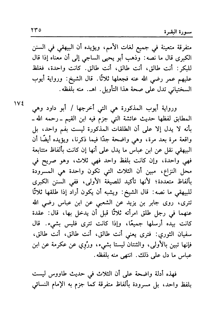 ورواية أيوب المذكورة هي التي أخرجها أبو داود وهي المطابق لفظها حديث عائشة الذي جزم فيه ابن القيم -رحمه الله- بأنه لا يدل إلا على أن الطلقات المذكورة ليست بفم واحد، بل واقعة مرة بعد مرة، وهي واضحة جدا فيما ذكرنا، ويؤيده أيضا أن البيهقي نقل عن ابن عباس ما يدل على أنها إن كانت بألفاظ متتابعة فهي واحدة، وإن كانت بلفظ واحد فهي ثلاث، وهو صريح في محل النزاع، مبين أن الثلاث التي تكون واحدة هي المسرودة بألفاظ متعددة؛ لأنها تأكيد للصيغة الأولى، ففي السنن الكبرى للبيهقي ما نصه: قال الشيخ: ويشبه أن يكون أراد إذا طلقها ثلاثا تترى، روى جابر بن يزيد عن الشعبي عن ابن عباس رضي الله عنهما في رجل طلق امرأته ثلاثا قبل أن يدخل بها، قال: عقدة كانت بيده أرسلها جميعا، وإذا كانت تترى فليس بشيء. قال سفيان الثوري: فترى يعني أنت طالق، أنت طالق، أنت طالق، فإنها تبين بالأولى، والثنتان ليستا بشيء، وروي عن عكرمة عن ابن عباس ما دل على ذلك. انتهى منه بلفظه.