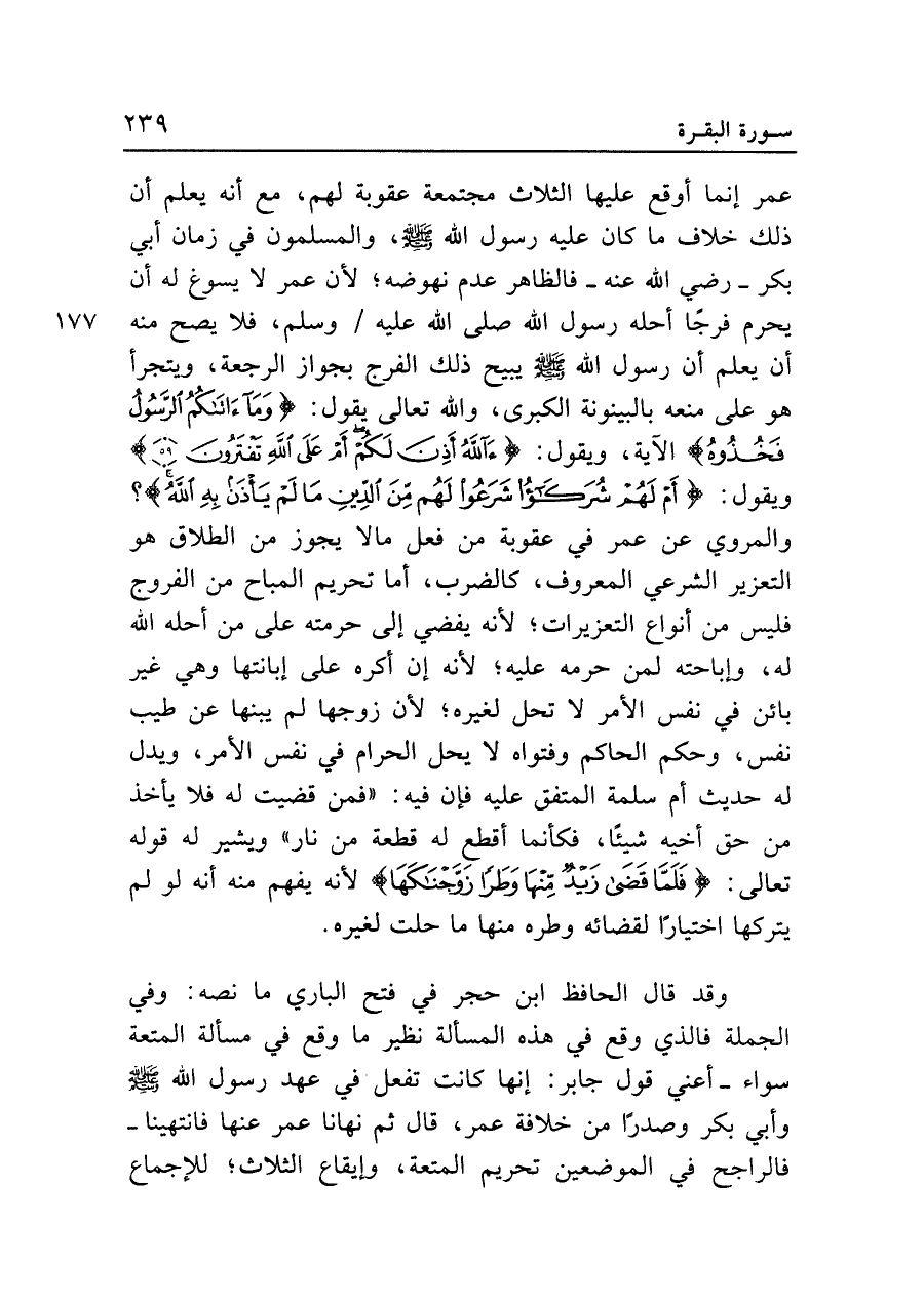 وقد قال الحافظ ابن حجر في فتح الباري ما نصه: وفي الجملة فالذي وقع في هذه المسألة نظير ما وقع في مسألة المتعة سواء -أعني قول جابر: إنها كانت تفعل في عهد رسول الله - صلى الله عليه وسلم - وأبي بكر وصدرا من خلافة عمر، قال ثم نهانا عمر عنها فانتهينا -فالراجح في الموضعين تحريم المتعة، وإيقاع الثلاث؛ للإجماع
