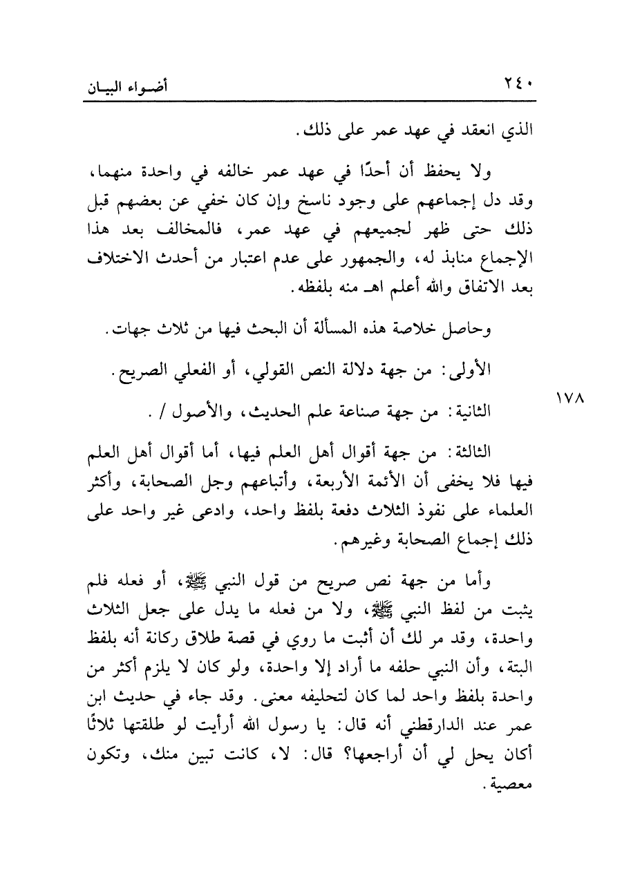 وأما من جهة نص صريح من قول النبي - صلى الله عليه وسلم -، أو فعله فلم يثبت من لفظ النبي - صلى الله عليه وسلم -، ولا من فعله ما يدل على جعل الثلاث واحدة، وقد مر لك أن أثبت ما روي في قصة طلاق ركانة أنه بلفظ البتة، وأن النبي حلفه ما أراد إلا واحدة، ولو كان لا يلزم أكثر من واحدة بلفظ واحد لما كان لتحليفه معنى. وقد جاء في حديث ابن عمر عند الدارقطني أنه قال: يا رسول الله أرأيت لو طلقتها ثلاثا أكان يحل لي أن أراجعها؟ قال: لا، كانت تبين منك، وتكون معصية.