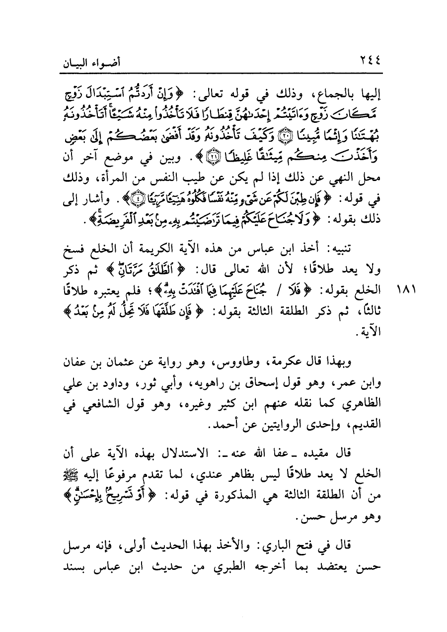 قال مقيده - عفا الله عنه -: الاستدلال بهذه الآية على أن الخلع لا يعد طلاقا ليس بظاهر عندي، لما تقدم مرفوعا إليه - صلى الله عليه وسلم - من أن الطلقة الثالثة هي المذكورة في قوله: {أَوْ تَسْرِيحٌ بِإِحْسَانٍ} وهو مرسل حسن.