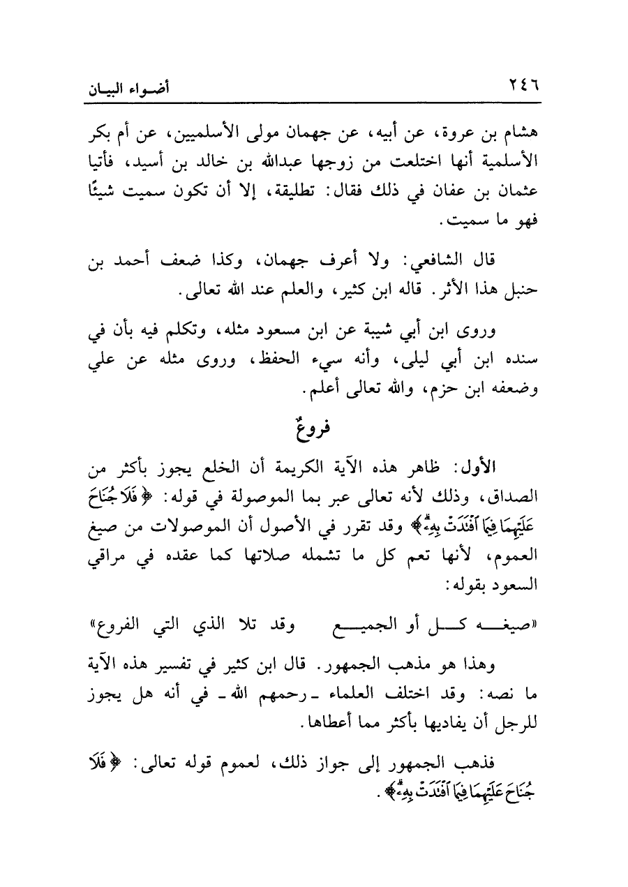الأول: ظاهر هذه الآية الكريمة أن الخلع يجوز بأكثر من الصداق، وذلك لأنه تعالى عبر بما الموصولة في قوله: {فَلا جُنَاحَ عَلَيْهِمَا فِيمَا افْتَدَتْ بِهِ} وقد تقرر في الأصول أن الموصولات من صيغ العموم، لأنها تعم كل ما تشمله صلاتها كما عقده في مراقي السعود بقوله: