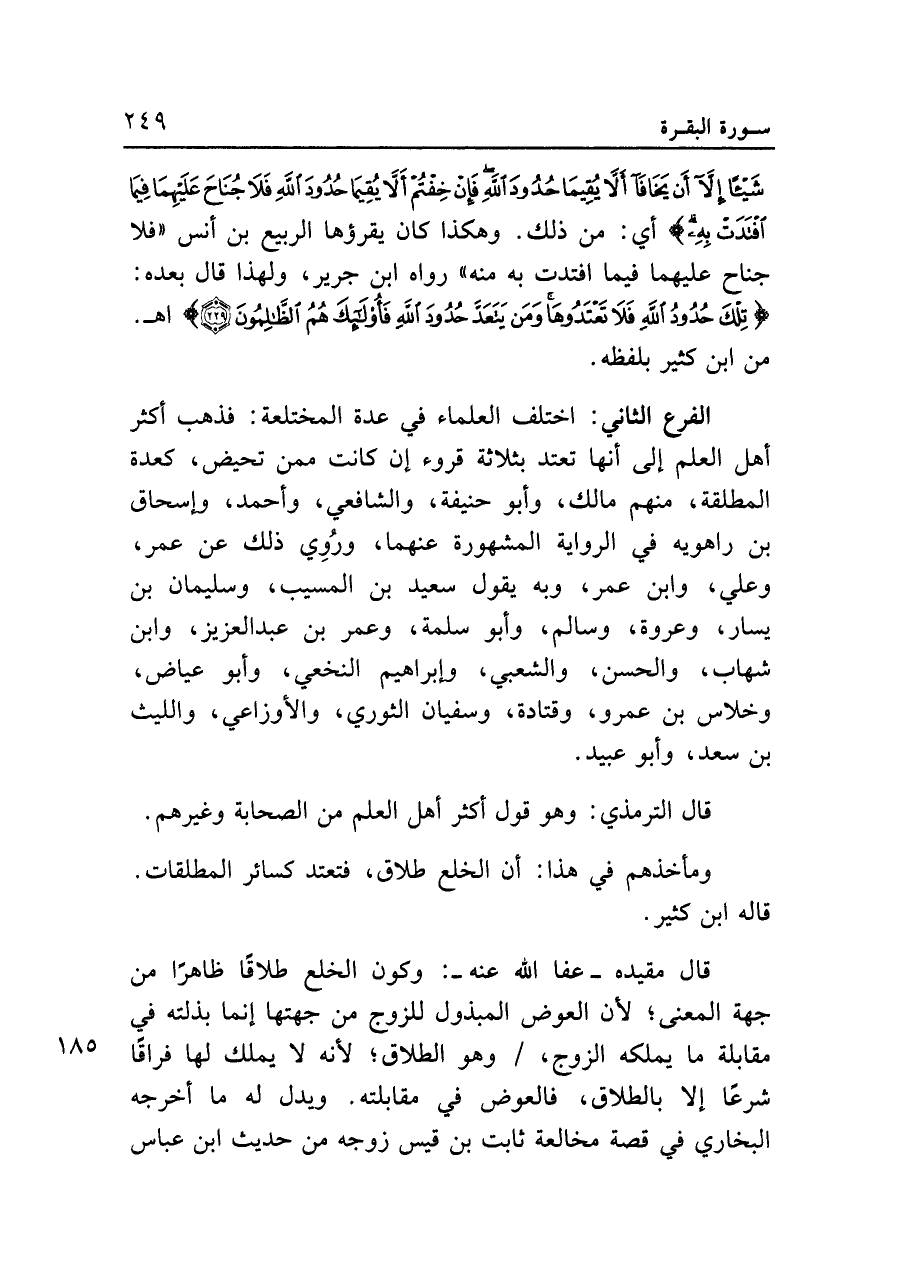 شَيْئاً إِلَّا أَنْ يَخَافَا أَلَّا يُقِيمَا حُدُودَ اللَّهِ فَإِنْ خِفْتُمْ أَلَّا يُقِيمَا حُدُودَ اللَّهِ فَلا جُنَاحَ عَلَيْهِمَا فِيمَا افْتَدَتْ بِهِ} أي: من ذلك. وهكذا كان يقرؤها الربيع بن أنس "فَلا جُنَاحَ عَلَيْهِمَا فِيمَا افْتَدَتْ بِه منه" رواه ابن جرير، ولهذا قال بعده: {تِلْكَ حُدُودُ اللَّهِ فَلا تَعْتَدُوهَا وَمَنْ يَتَعَدَّ حُدُودَ اللَّهِ فَأُولَئِكَ هُمُ الظَّالِمُونَ (٢٢٩)} اهـ. من ابن كثير بلفظه.
