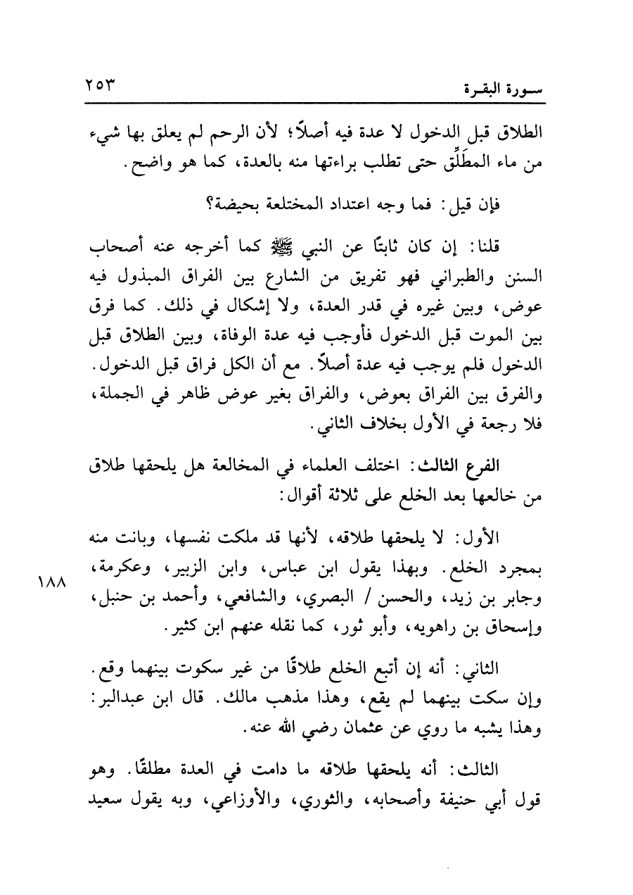 قلنا: إن كان ثابتا عن النبي - صلى الله عليه وسلم - كما أخرجه عنه أصحاب السنن والطبراني فهو تفريق من الشارع بين الفراق المبذول فيه عوض، وبين غيره في قدر العدة، ولا إشكال في ذلك. كما فرق بين الموت قبل الدخول فأوجب فيه عدة الوفاة، وبين الطلاق قبل الدخول فلم يوجب فيه عدة أصلا. مع أن الكل فراق قبل الدخول. والفرق بين الفراق بعوض، والفراق بغير عوض ظاهر في الجملة، فلا رجعة في الأول بخلاف الثاني.