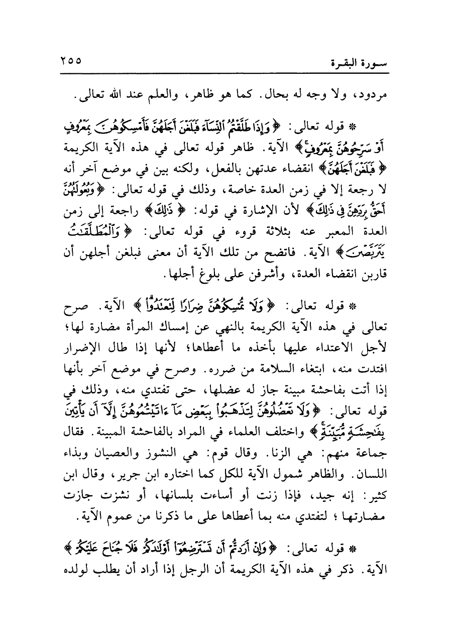 • قوله تعالى: {وَإِذَا طَلَّقْتُمُ النِّسَاءَ فَبَلَغْنَ أَجَلَهُنَّ فَأَمْسِكُوهُنَّ بِمَعْرُوفٍ أَوْ سَرِّحُوهُنَّ بِمَعْرُوفٍ} الآية. ظاهر قوله تعالى في هذه الآية الكريمة {فَبَلَغْنَ أَجَلَهُنَّ} انقضاء عدتهن بالفعل، ولكنه بين في موضع آخر أنه لا رجعة إلا في زمن العدة خاصة، وذلك في قوله تعالى: {وَبُعُولَتُهُنَّ أَحَقُّ بِرَدِّهِنَّ فِي ذَلِكَ} لأن الإشارة في قوله: {ذَلِكَ} راجعة إلى زمن العدة المعبر عنه بثلاثة قروء في قوله تعالى: {وَالْمُطَلَّقَاتُ يَتَرَبَّصْنَ} الآية. فاتضح من تلك الآية أن معنى فَبَلَغْنَ أَجَلَهُنَّ أن قاربن انقضاء العدة، وأشرفن على بلوغ أجلها.