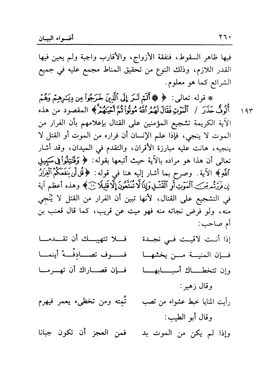 • قوله تعالى: {أَلَمْ تَرَ إِلَى الَّذِينَ خَرَجُوا مِنْ دِيَارِهِمْ وَهُمْ أُلُوفٌ حَذَرَ الْمَوْتِ فَقَالَ لَهُمُ اللَّهُ مُوتُوا ثُمَّ أَحْيَاهُمْ} المقصود من هذه الآية الكريمة تشجيع المؤمنين على القتال بإعلامهم بأن الفرار من الموت لا ينجي، فإذا علم الإنسان أن فراره من الموت أو القتل لا ينجيه، هانت عليه مبارزة الأقران، والتقدم في الميدان، وقد أشار تعالى أن هذا هو مراده بالآية حيث أتبعها بقوله: {وَقَاتِلُوا فِي سَبِيلِ اللَّهِ} الآية. وصرح بما أشار إليه هنا في قوله: {قُلْ لَنْ يَنْفَعَكُمُ الْفِرَارُ إِنْ فَرَرْتُمْ مِنَ الْمَوْتِ أَوِ الْقَتْلِ وَإِذاً لا تُمَتَّعُونَ إِلَّا قَلِيلاً (١٦)} وهذه أعظم آية في التشجيع على القتال، لأنها تبين أن الفرار من القتل لا ينجي منه، ولو فرض نجاته منه فهو ميت عن قريب، كما قال قعنب بن أم صاحب: