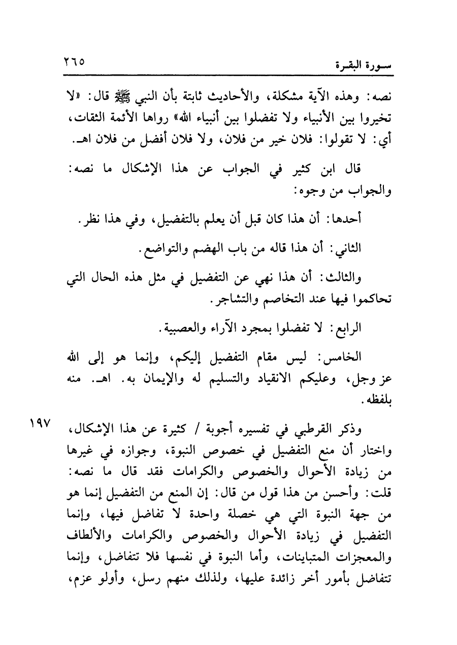 وذكر القرطبي في تفسيره أجوبة كثيرة عن هذا الإشكال، واختار أن منع التفضيل في خصوص النبوة، وجوازه في غيرها من زيادة الأحوال والخصوص والكرامات فقد قال ما نصه: قلت: وأحسن من هذا قول من قال: إن المنع من التفضيل إنما هو من جهة النبوة التي هي خصلة واحدة لا تفاضل فيها، وإنما التفضيل في زيادة الأحوال والخصوص والكرامات والألطاف والمعجزات المتباينات، وأما النبوة في نفسها فلا تتفاضل، وإنما تتفاضل بأمور أخر زائدة عليها، ولذلك منهم رسل، وأولو عزم،