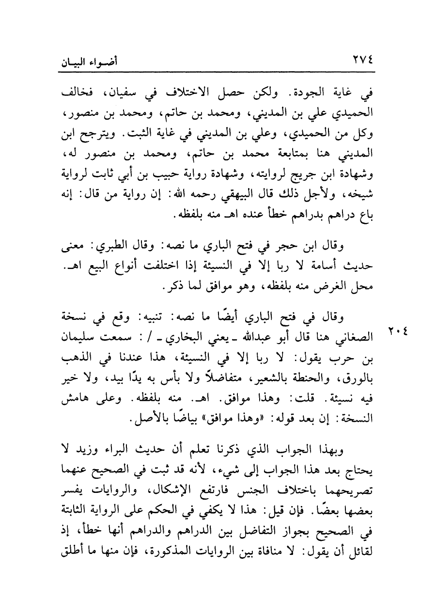 وبهذا الجواب الذي ذكرنا تعلم أن حديث البراء وزيد لا يحتاج بعد هذا الجواب إلى شيء، لأنه قد ثبت في الصحيح عنهما تصريحهما باختلاف الجنس فارتفع الإشكال، والروايات يفسر بعضها بعضا. فإن قيل: هذا لا يكفي في الحكم على الرواية الثابتة في الصحيح بجواز التفاضل بين الدراهم والدراهم أنها خطأ، إذ لقائل أن يقول: لا منافاة بين الروايات المذكورة، فإن منها ما أطلق