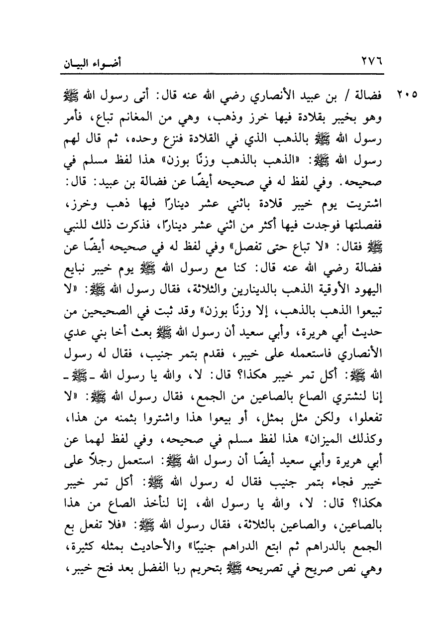 فضالة بن عبيد الأنصاري رضي الله عنه قال: أتي رسول الله - صلى الله عليه وسلم - وهو بخيبر بقلادة فيها خرز وذهب، وهي من المغانم تباع، فأمر رسول الله - صلى الله عليه وسلم - بالذهب الذي في القلادة فنزع وحده، ثم قال لهم رسول الله - صلى الله عليه وسلم -: "الذهب بالذهب وزنا بوزن" هذا لفظ مسلم في صحيحه. وفي لفظ له في صحيحه أيضا عن فضالة بن عبيد: قال: اشتريت يوم خيبر قلادة باثني عشر دينارا فيها ذهب وخرز، ففصلتها فوجدت فيها أكثر من اثني عشر دينارا، فذكرت ذلك للنبي - صلى الله عليه وسلم - فقال: "لا تباع حتى تفصل" وفي لفظ له في صحيحه أيضا عن فضالة رضي الله عنه قال: كنا مع رسول الله - صلى الله عليه وسلم - يوم خيبر نبايع اليهود الأوقية الذهب بالدينارين والثلاثة، فقال رسول الله - صلى الله عليه وسلم -: "لا تبيعوا الذهب بالذهب، إلا وزنا بوزن" وقد ثبت في الصحيحين من حديث أبي هريرة، وأبي سعيد أن رسول الله - صلى الله عليه وسلم - بعث أخا بني عدي الأنصاري فاستعمله على خيبر، فقدم بتمر جنيب، فقال له رسول الله - صلى الله عليه وسلم -: أكل تمر خيبر هكذا؟ قال: لا، والله يا رسول الله - صلى الله عليه وسلم - إنا لنشتري الصاع بالصاعين من الجمع، فقال رسول الله - صلى الله عليه وسلم -: "لا تفعلوا، ولكن مثل بمثل، أو بيعوا هذا واشتروا بثمنه من هذا، وكذلك الميزان" هذا لفظ مسلم في صحيحه، وفي لفظ لهما عن أبي هريرة وأبي سعيد أيضا أن رسول الله - صلى الله عليه وسلم -: استعمل رجلا على خيبر فجاء بتمر جنيب فقال له رسول الله - صلى الله عليه وسلم -: أكل تمر خيبر هكذا؛ قال: لا، والله يا رسول الله، إنا لنأخذ الصاع من هذا بالصاعين، والصاعين بالثلاثة، فقال رسول الله - صلى الله عليه وسلم -: "فلا تفعل بع الجمع بالدراهم ثم ابتع الدراهم جنيبا" والأحاديث بمثله كثيرة، وهي نص صريح في تصريحه - صلى الله عليه وسلم - بتحريم ربا الفضل بعد فتح خيبر،
