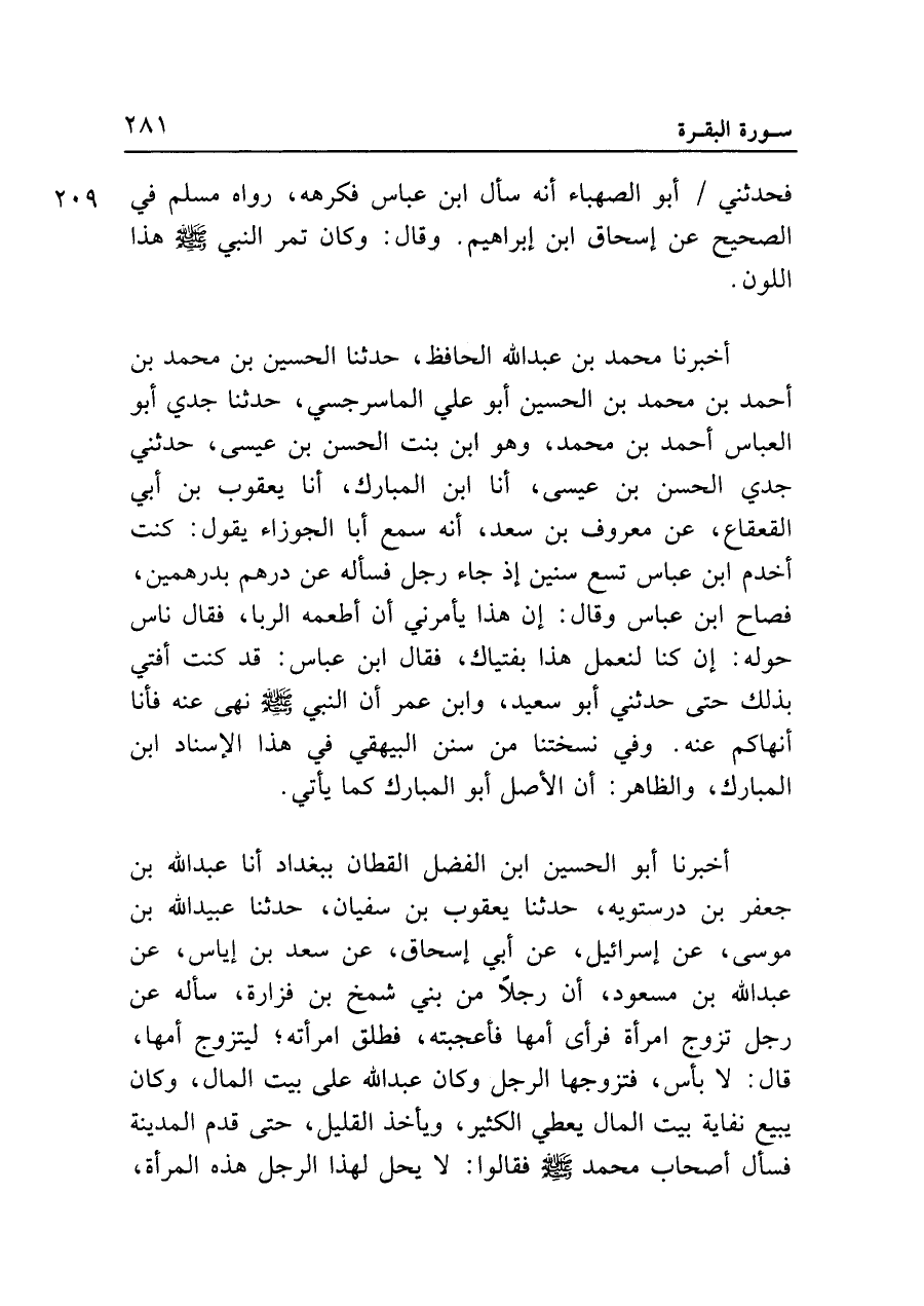 أخبرنا محمد بن عبد الله الحافظ، حدثنا الحسين بن محمد بن أحمد بن محمد بن الحسين أبو علي الماسرجسي، حدثنا جدي أبو العباس أحمد بن محمد، وهو ابن بنت الحسن بن عيسى، حدثني جدي الحسن بن عيسى، أنا ابن المبارك، أنا يعقوب بن أبي القعقاع، عن معروف بن سعد، أنه سمع أبا الجوزاء يقول: كنت أخدم ابن عباس تسع سنين إذ جاء رجل فسأله عن درهم بدرهمين، فصاح ابن عباس وقال: إن هذا يأمرني أن أطعمه الربا، فقال ناس حوله: إن كنا لنعمل هذا بفتياك، فقال ابن عباس: قد كنت أفتي بذلك حتى حدثني أبو سعيد، وابن عمر أن النبي - صلى الله عليه وسلم - نهى عنه فأنا أنهاكم عنه. وفي نسختنا من سنن البيهقي في هذا الإسناد ابن المبارك، والظاهر: أن الأصل أبو المبارك كما يأتي.