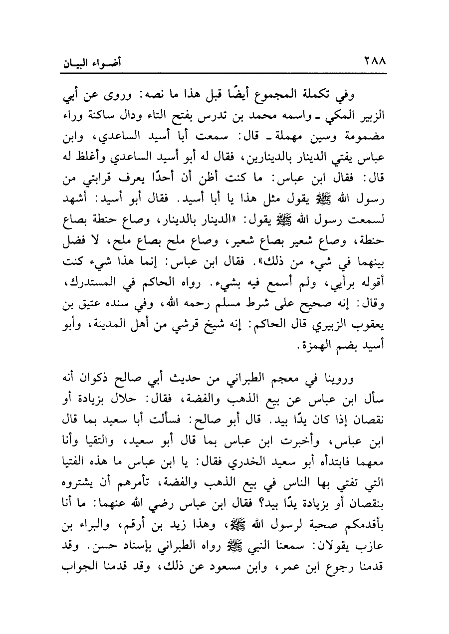وفي تكملة المجموع أيضا قبل هذا ما نصه: وروى عن أبي الزبير المكي -واسمه محمد بن تدرس بفتح التاء ودال ساكنة وراء مضمومة وسين مهملة- قال: سمعت أبا أسيد الساعدي، وابن عباس يفتي الدينار بالدينارين، فقال له أبو أسيد الساعدي وأغلظ له قال: فقال ابن عباس: ما كنت أظن أن أحدا يعرف قرابتي من رسول الله - صلى الله عليه وسلم - يقول مثل هذا يا أبا أسيد. فقال أبو أسيد: أشهد لسمعت رسول الله - صلى الله عليه وسلم - يقول: "الدينار بالدينار، وصاع حنطة بصاع حنطة، وصاع شعير بصاع شعير، وصاع ملح بصاع ملح، لا فضل بينهما في شيء من ذلك". فقال ابن عباس: إنما هذا شيء كنت أقوله برأيي، ولم أسمع فيه بشيء. رواه الحاكم في المستدرك، وقال: إنه صحيح على شرط مسلم رحمه الله، وفي سنده عتيق بن يعقوب الزبيري قال الحاكم: إنه شيخ قرشي من أهل المدينة، وأبو أسيد بضم الهمزة.