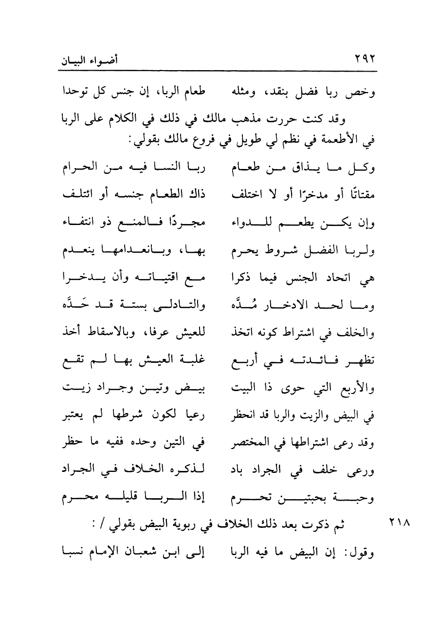 وقد كنت حررت مذهب مالك في ذلك في الكلام على الربا في الأطعمة في نظم لي طويل في فروع مالك بقولي: