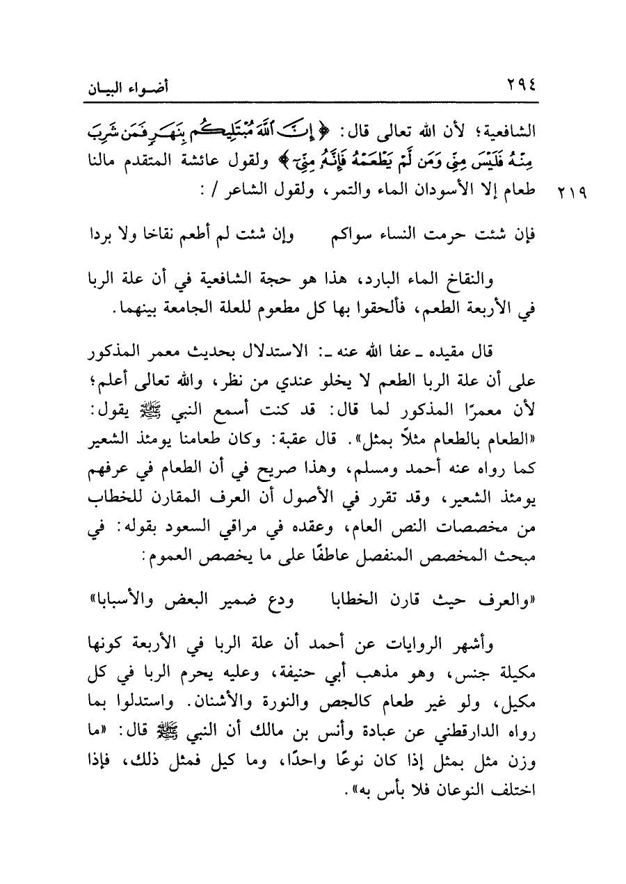 قال مقيده - عفا الله عنه -: الاستدلال بحديث معمر المذكور على أن علة الربا الطعم لا يخلو عندي من نظر، والله تعالى أعلم؛ لأن معمرا المذكور لما قال: قد كنت أسمع النبي - صلى الله عليه وسلم - يقول: "الطعام بالطعام مثلا بمثل". قال عقبة: وكان طعامنا يومئذ الشعير كما رواه عنه أحمد ومسلم، وهذا صريح في أن الطعام في عرفهم يومئذ الشعير، وقد تقرر في الأصول أن العرف المقارن للخطاب من مخصصات النص العام، وعقده في مراقي السعود بقوله: في مبحث المخصص المنفصل عاطفا على ما يخصص العموم: