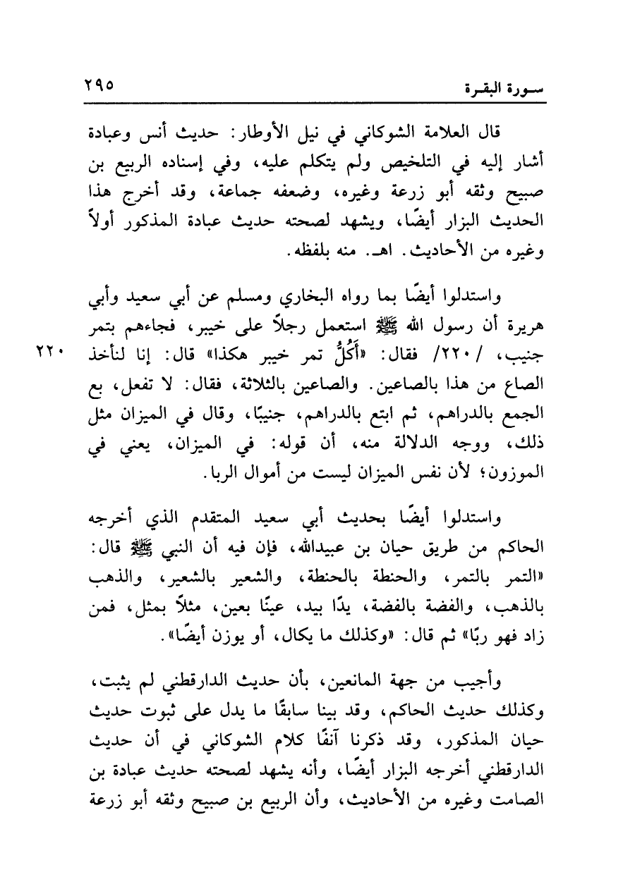 واستدلوا أيضا بما رواه البخاري ومسلم عن أبي سعيد وأبي هريرة أن رسول الله - صلى الله عليه وسلم - استعمل رجلا على خيبر، فجاءهم بتمر جنيب، فقال: "أكل تمر خيبر هكذا" قال: إنا لنأخذ الصاع من هذا بالصاعين. والصاعين بالثلاثة، فقال: لا تفعل، بع الجمع بالدراهم، ثم ابتع بالدراهم، جنيبا، وقال في الميزان مثل ذلك، ووجه الدلالة منه، أن قوله: في الميزان، يعني في الموزون؛ لأن نفس الميزان ليست من أموال الربا.