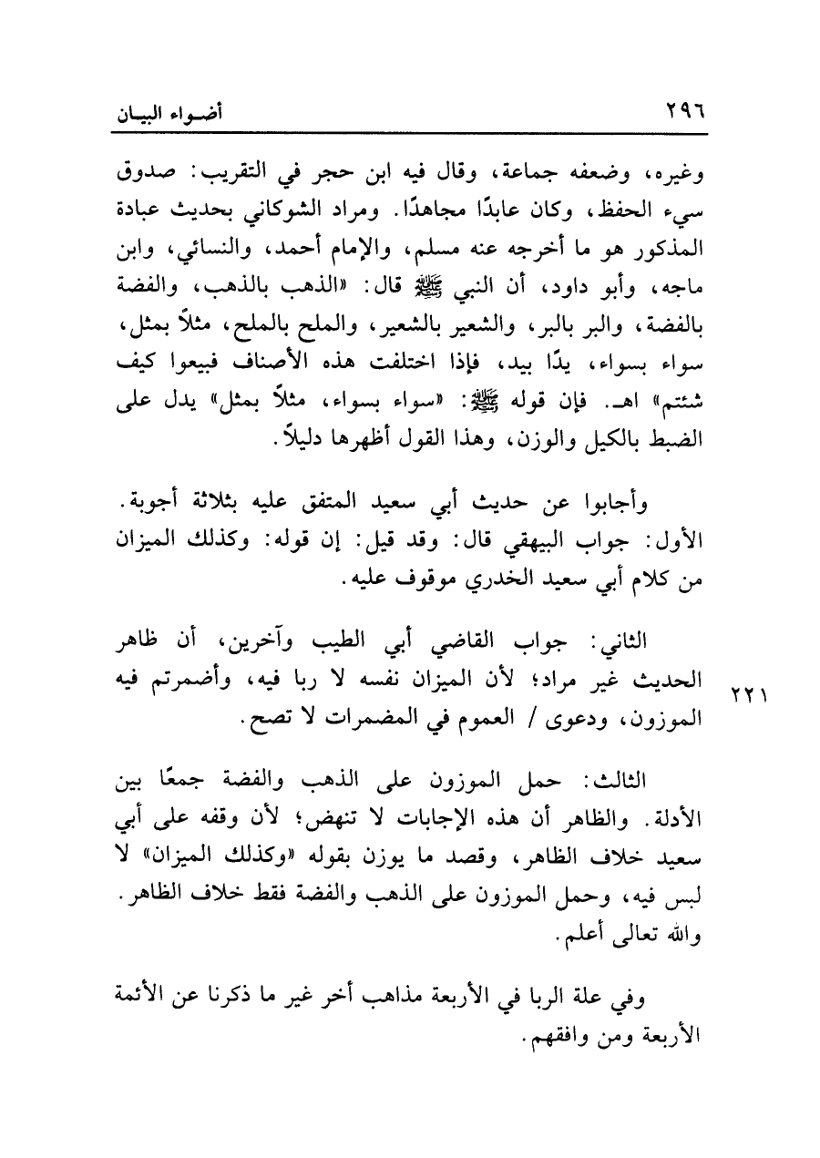 الثالث: حمل الموزون على الذهب والفضة جمعا بين الأدلة. والظاهر أن هذه الإجابات لا تنهض؛ لأن وقفه على أبي سعيد خلاف الظاهر، وقصد ما يوزن بقوله "وكذلك الميزان" لا لبس فيه، وحمل الموزون على الذهب والفضة فقط خلاف الظاهر. والله تعالى أعلم.