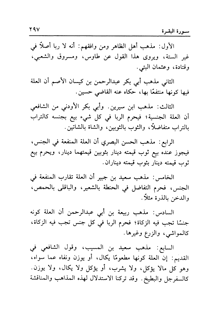 الخامس: مذهب سعيد بن جبير أن العلة تقارب المنفعة في الجنس، فحرم التفاضل في الحنطة بالشعير، والباقلي بالحمص، والدخن بالذرة مثلا.