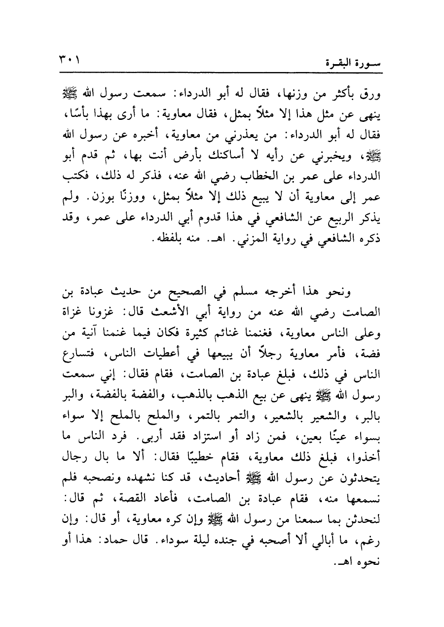 ونحو هذا أخرجه مسلم في الصحيح من حديث عبادة بن الصامت رضي الله عنه من رواية أبي الأشعث قال: غزونا غزاة وعلى الناس معاوية، فغنمنا غنائم كثيرة فكان فيما غنمنا آنية من فضة، فأمر معاوية رجلا أن يبيعها في أعطيات الناس، فتسارع الناس في ذلك، فبلغ عبادة بن الصامت، فقام فقال: إني سمعت رسول الله - صلى الله عليه وسلم - ينهى عن بيع الذهب بالذهب، والفضة بالفضة، والبر بالبر، والشعير بالشعير، والتمر بالتمر، والملح بالملح إلا سواء بسواء عينا بعين، فمن زاد أو استزاد فقد أربى. فرد الناس ما أخذوا، فبلغ ذلك معاوية، فقام خطيبا فقال: ألا ما بال رجال يتحدثون عن رسول الله - صلى الله عليه وسلم - أحاديث، قد كنا نشهده ونصحبه فلم نسمعها منه، فقام عبادة بن الصامت، فأعاد القصة، ثم قال: لنحدثن بما سمعنا من رسول الله - صلى الله عليه وسلم - وإن كره معاوية، أو قال: وإن رغم، ما أبالي ألا أصحبه في جنده ليلة سوداء. قال حماد: هذا أو نحوه اهـ.